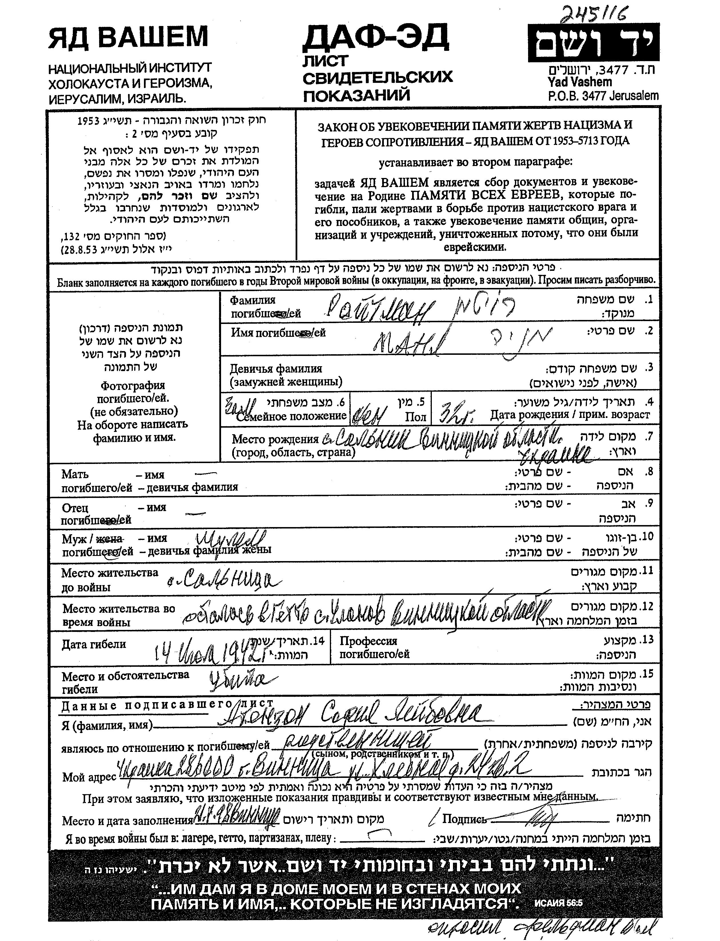 Yad Vashem - Pages of Testimony Names Memorial Collection