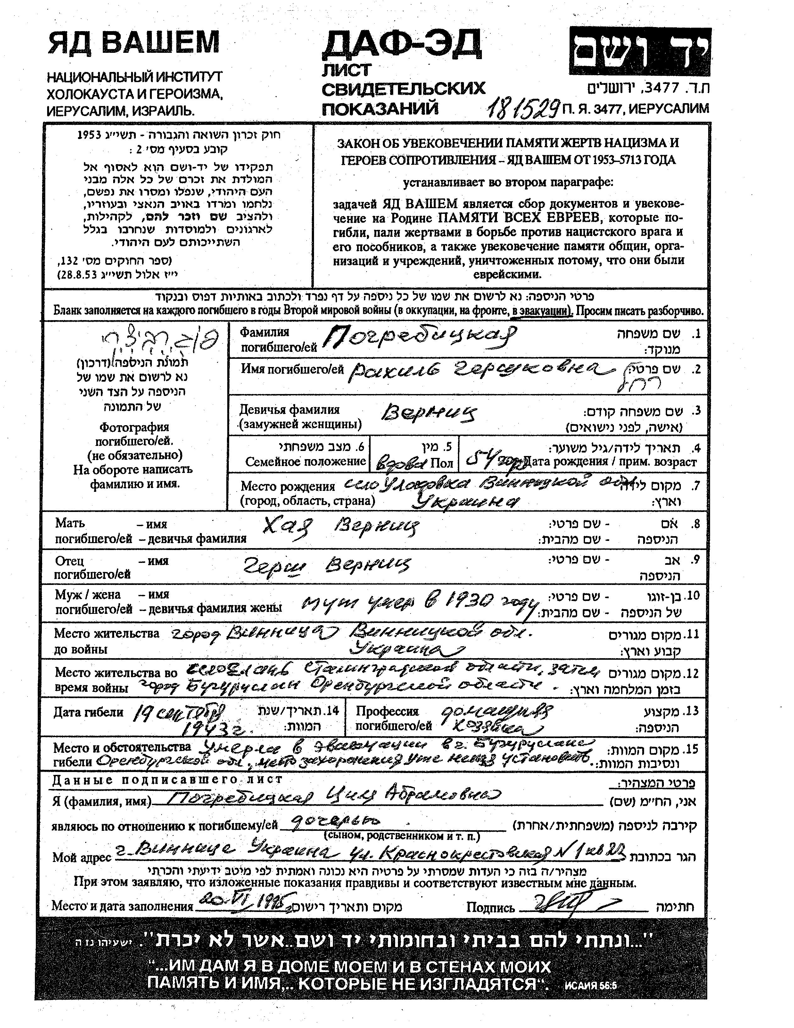 Pogrebitzki Rakhil 1889 Vinnitsa, Ukraine (URSS) Feuille de témoignage