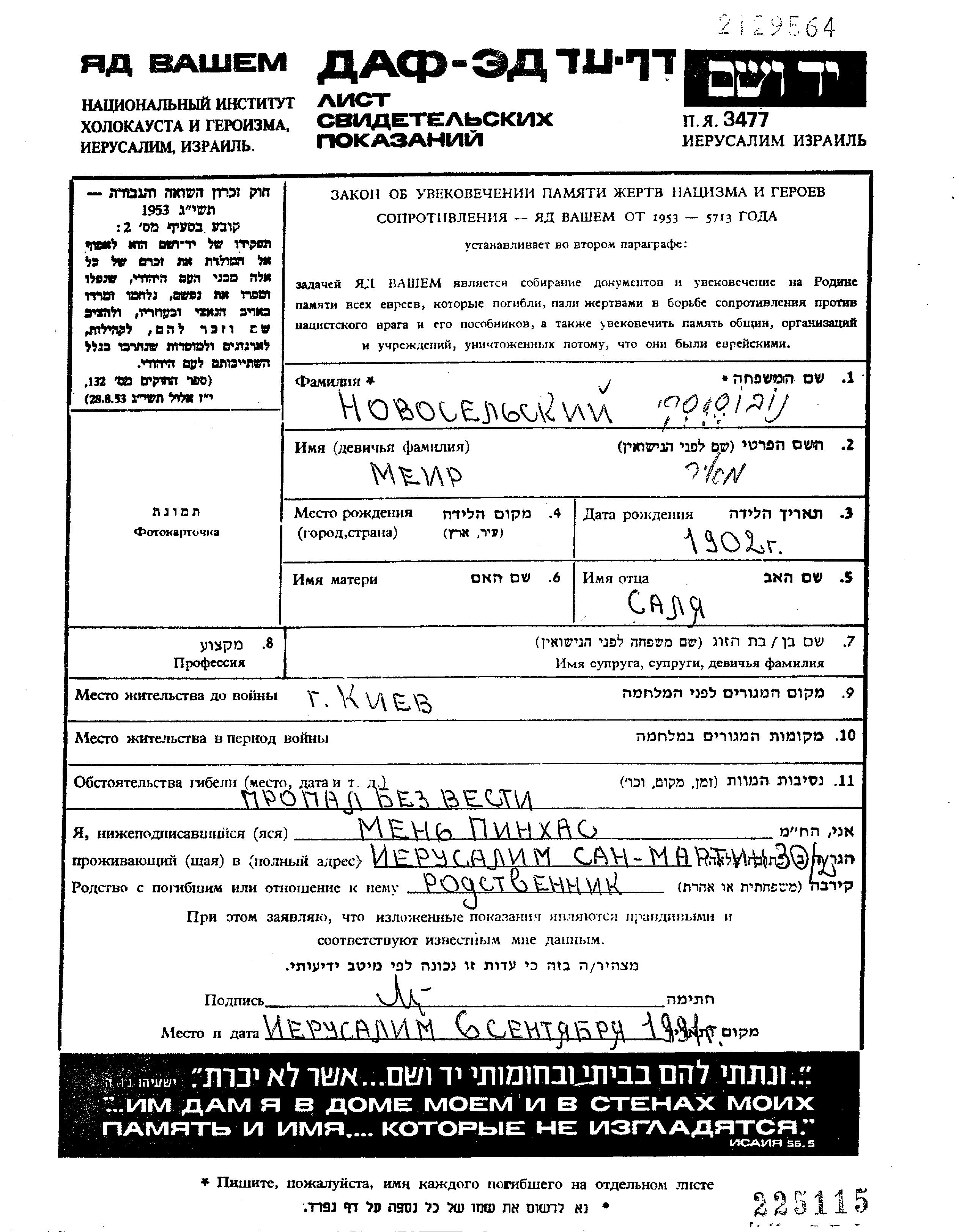 Novoselski Meir 1902 Kiyev, Ukraine (URSS) Feuille de témoignage