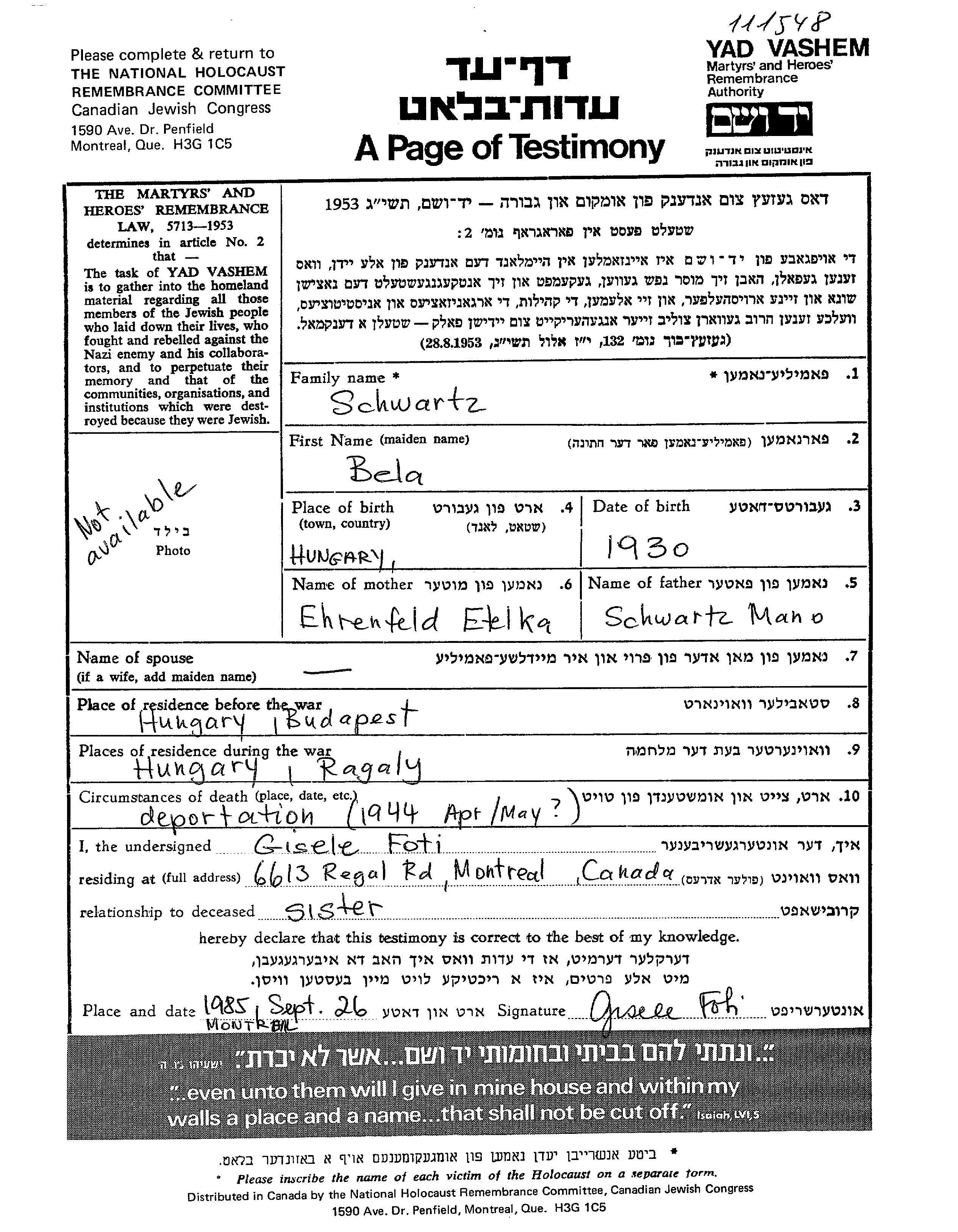 Bela Schwartz est né à Hongrie en 1930, fils de Emanuel et de Etelka née Ehrenfeld. Il était Enfant. Avant la seconde guerre mondiale il vivait à Budapest, Hongrie. Au cours de la guerre, il était à Ragaly, Hongrie.