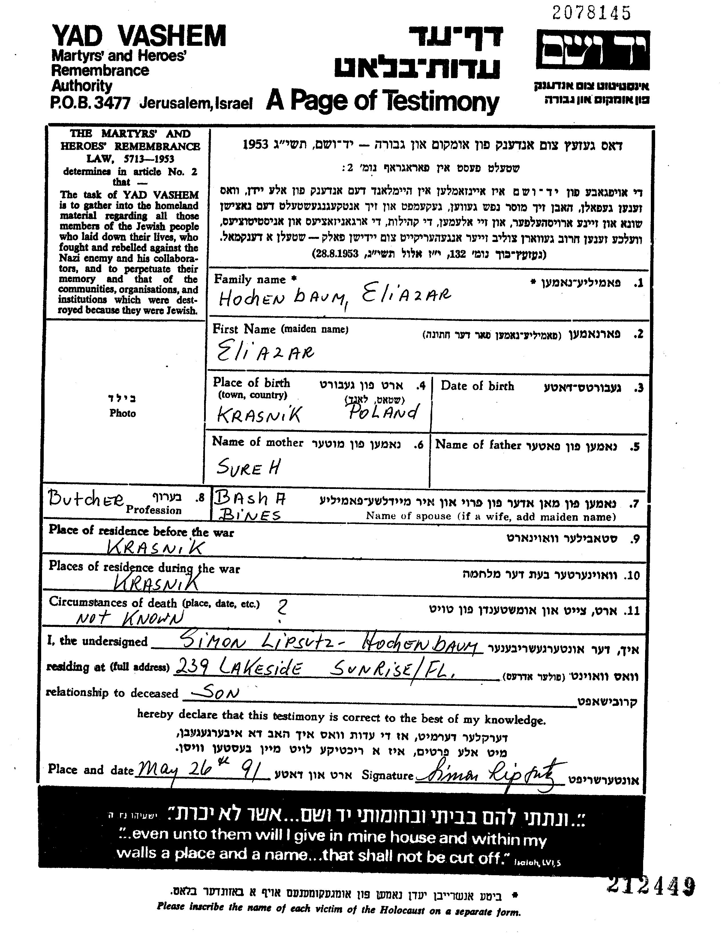 Eliazar Hochenbaum est né à Kraśnik, Pologne, fils de Sureh. Il était Boucher et Mariée à Basha Sara. Avant la seconde guerre mondiale il vivait à Kraśnik, Pologne. Au cours de la guerre, il était à Lublin, Pologne.