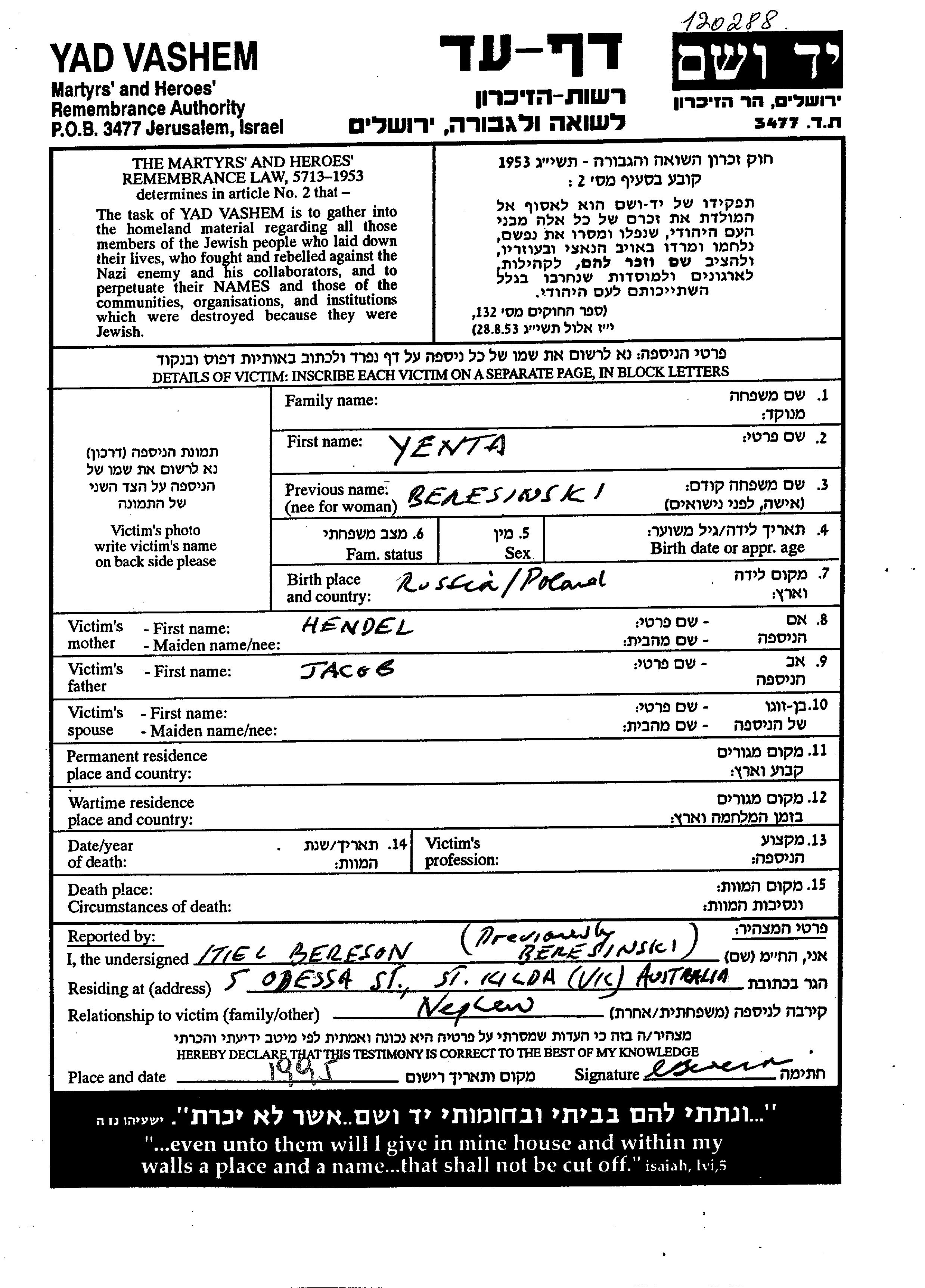 Yenta nom inconnu née Beresinski est née à Pologne, fille de Jacob Zvi et de Hendel. Avant la seconde guerre mondiale elle vivait à Pologne. Pendant la guerre, elle était à Pologne.