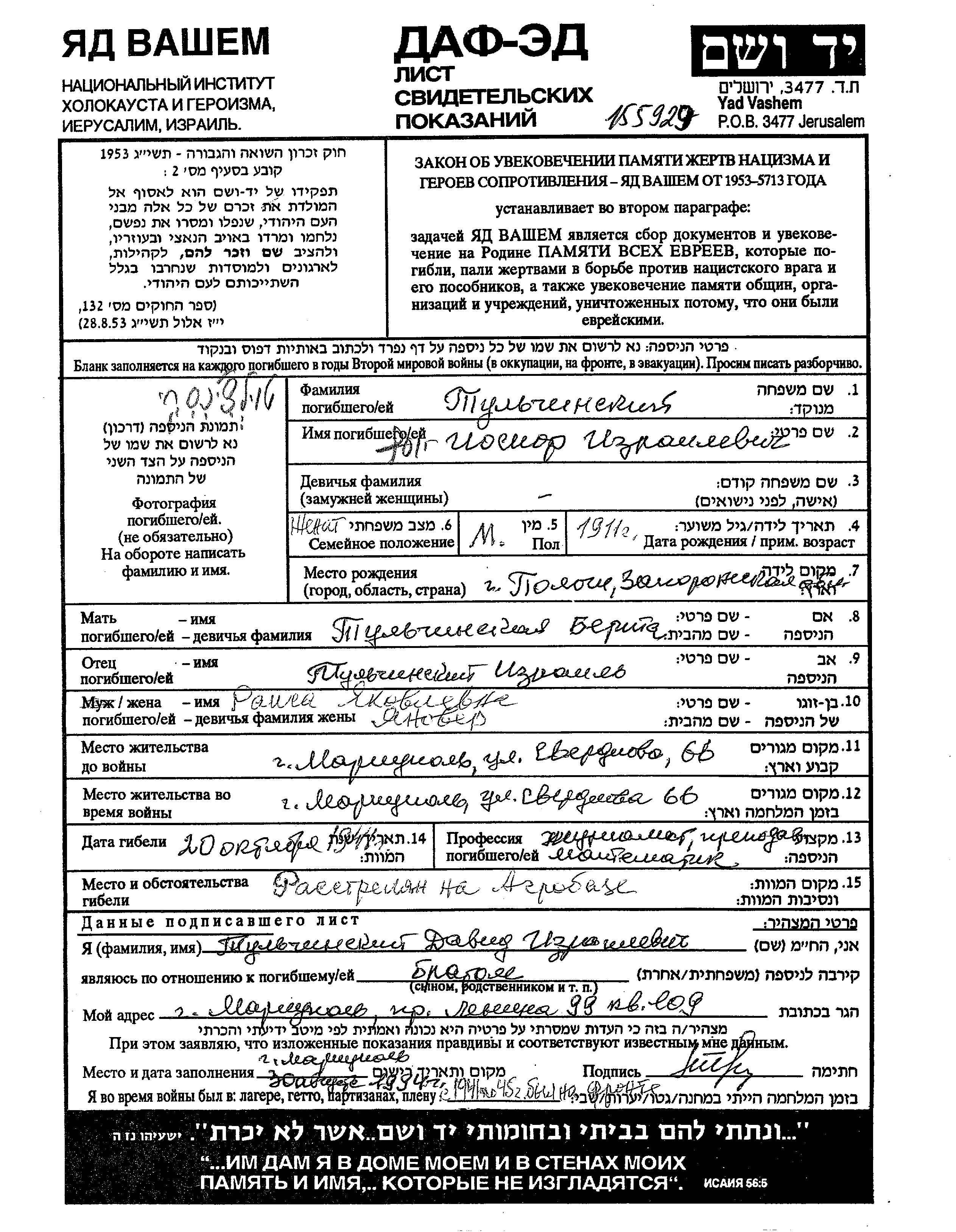 Tulchinski Iosif 1911 Mariupol, Ukraine (URSS) Feuille de témoignage