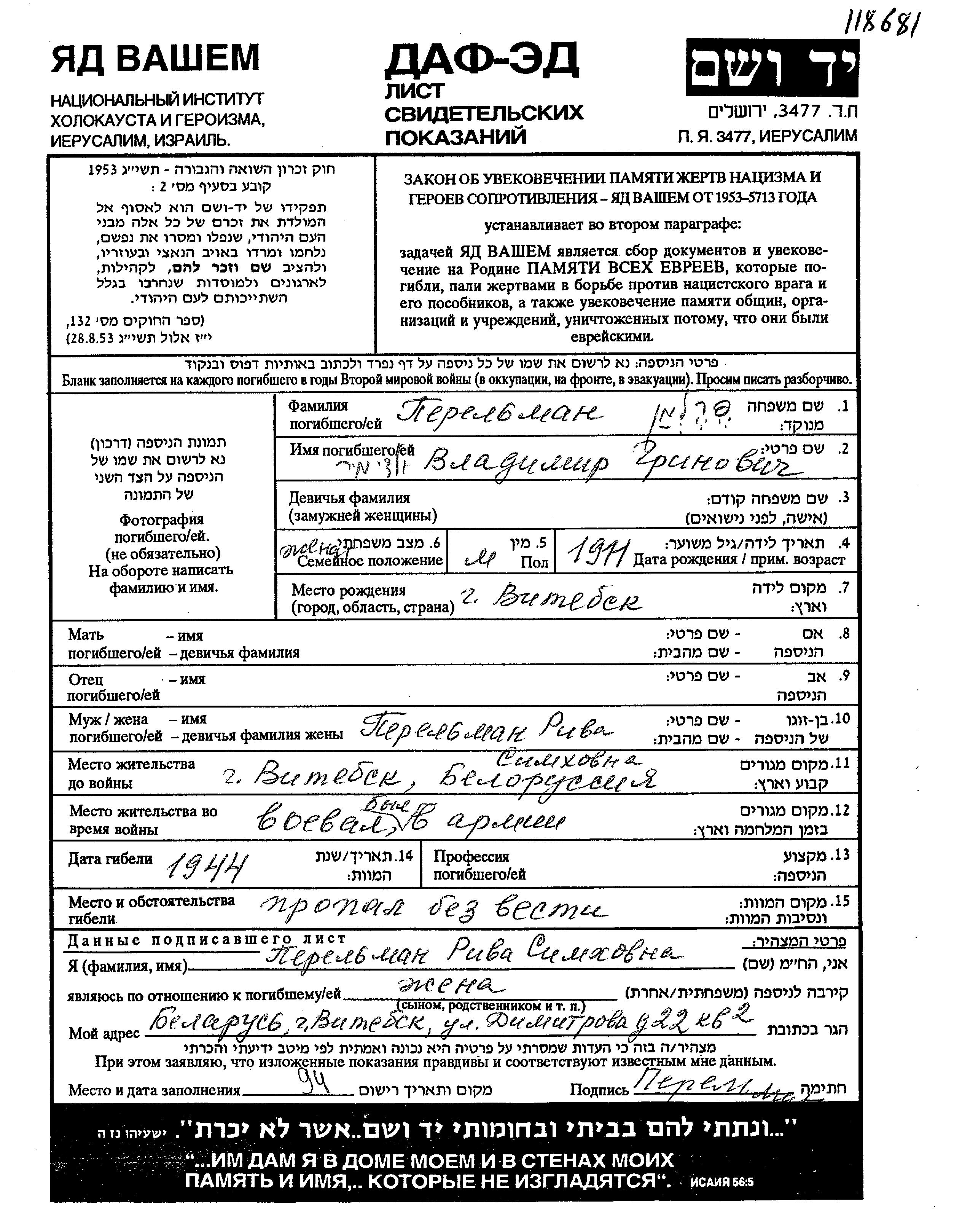 Perelman Vladimir 1911 Vitebsk, Bélorussie (URSS) Feuille de témoignage