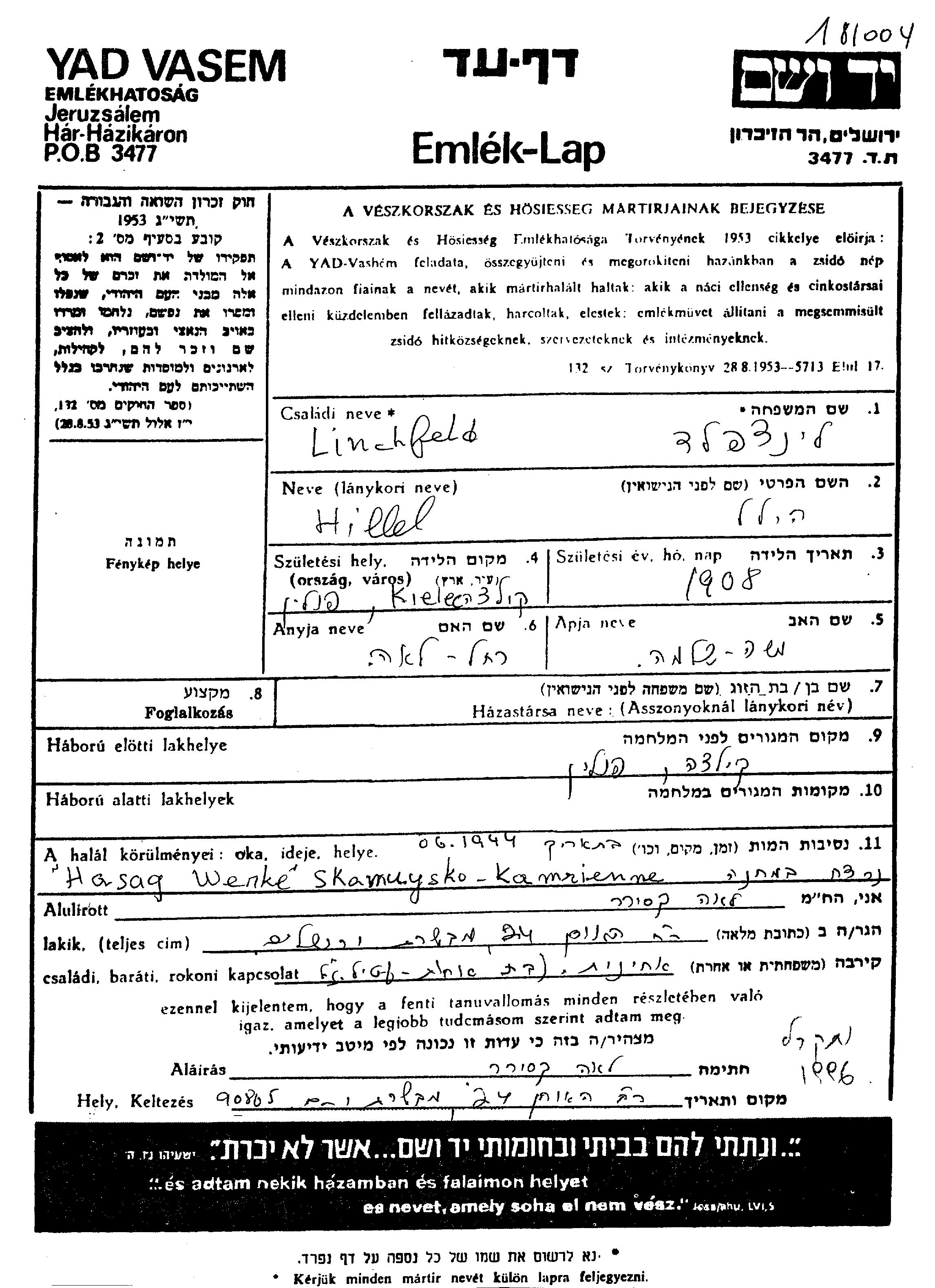 Hillel Linzefeld est né à Kielce, Pologne en 1908, fils de Moshe Shlomo et de Rachel Lea. Avant la seconde guerre mondiale il vivait à Kielce, Pologne. Au cours de la guerre, il était à Kielce, Pologne.