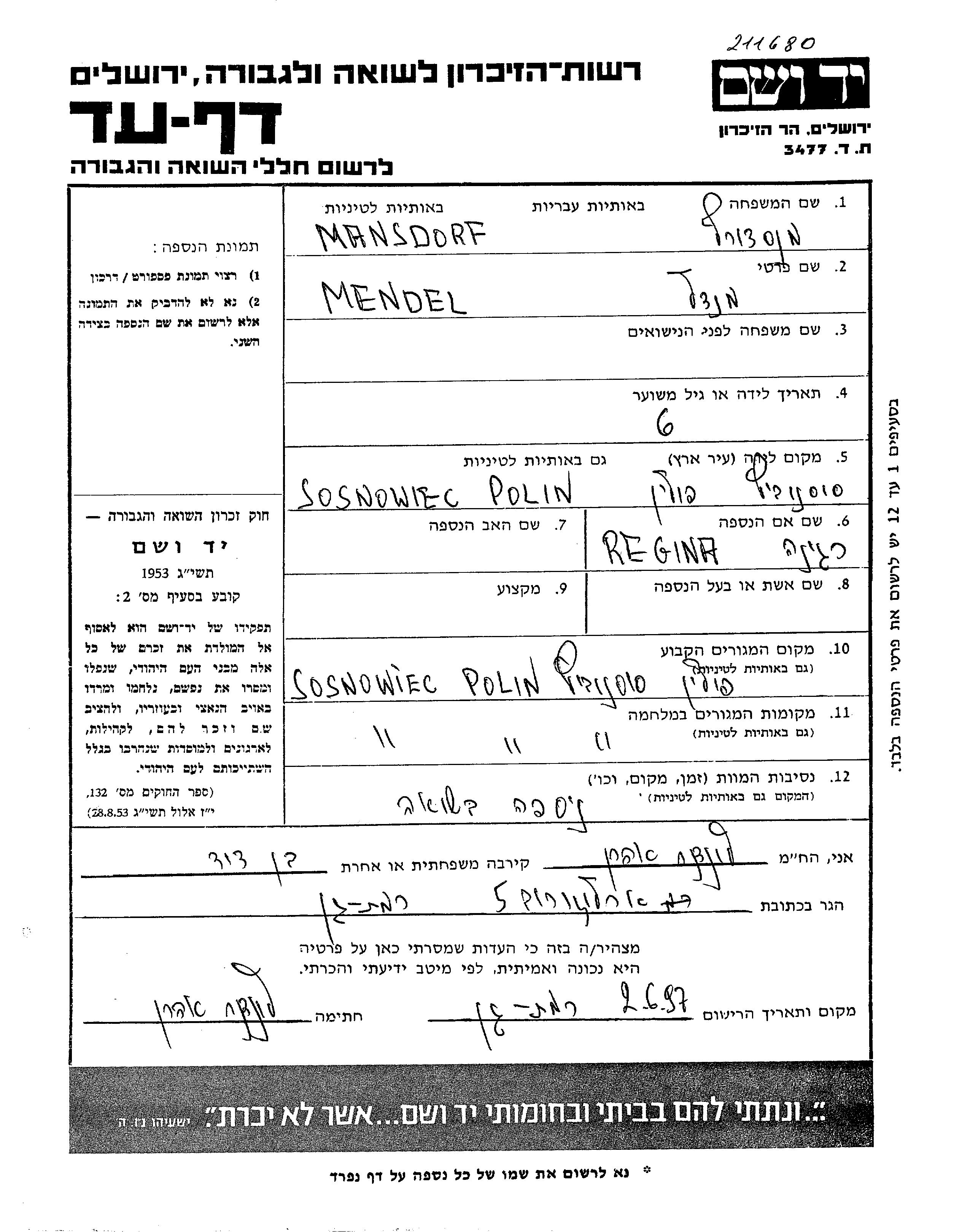 Mansdorf Mendel Sosnowiec, Pologne Feuille de témoignage