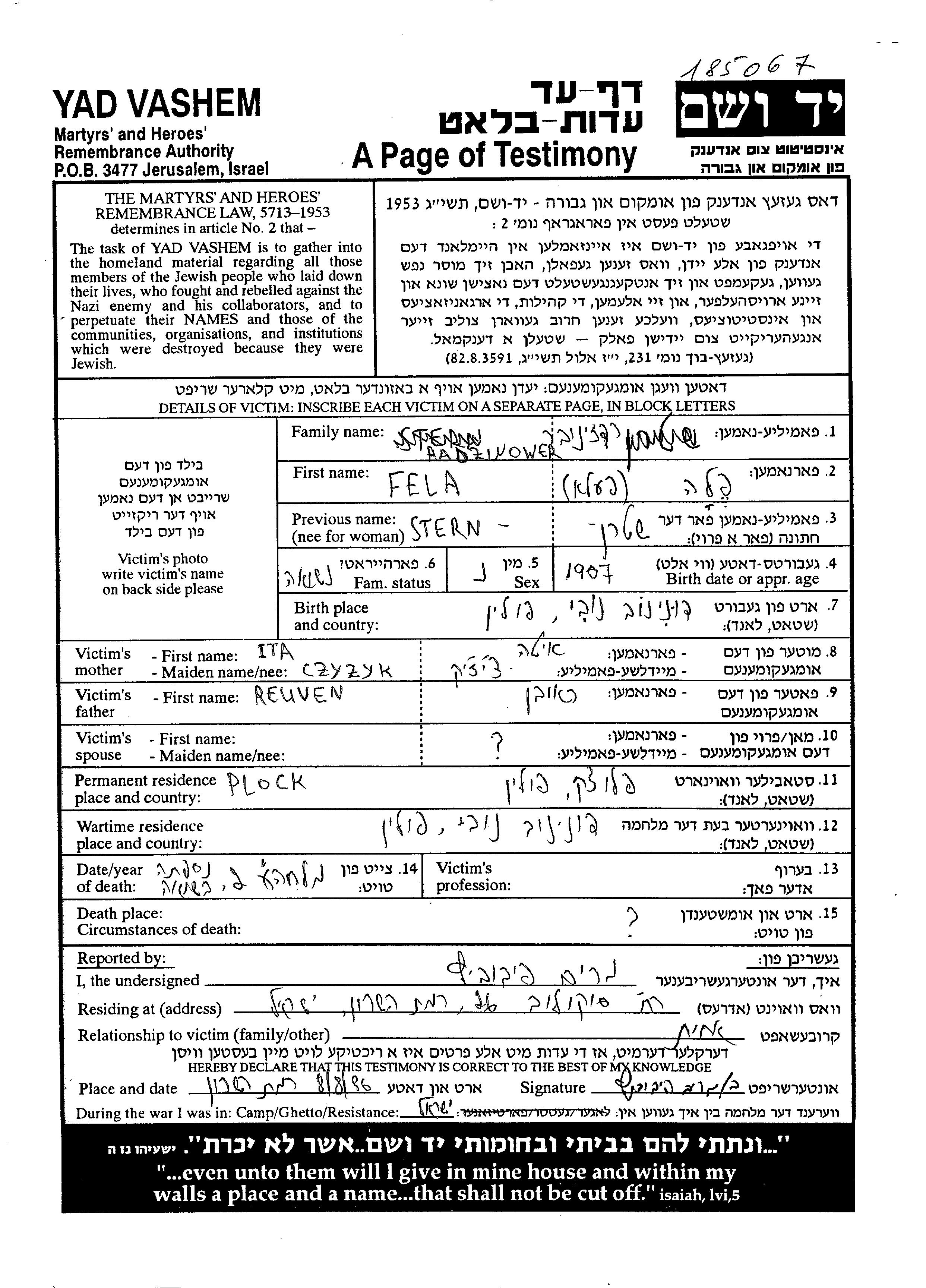 Fela Radzinower née Stern est née à Duninow Nowy, Pologne en 1907, fille de Reuven et de Ita née Czyzyk. Elle était Mariée. Avant la seconde guerre mondiale elle vivait à Plock, Pologne. Pendant la guerre, elle était à Duninow Nowy, Pologne.