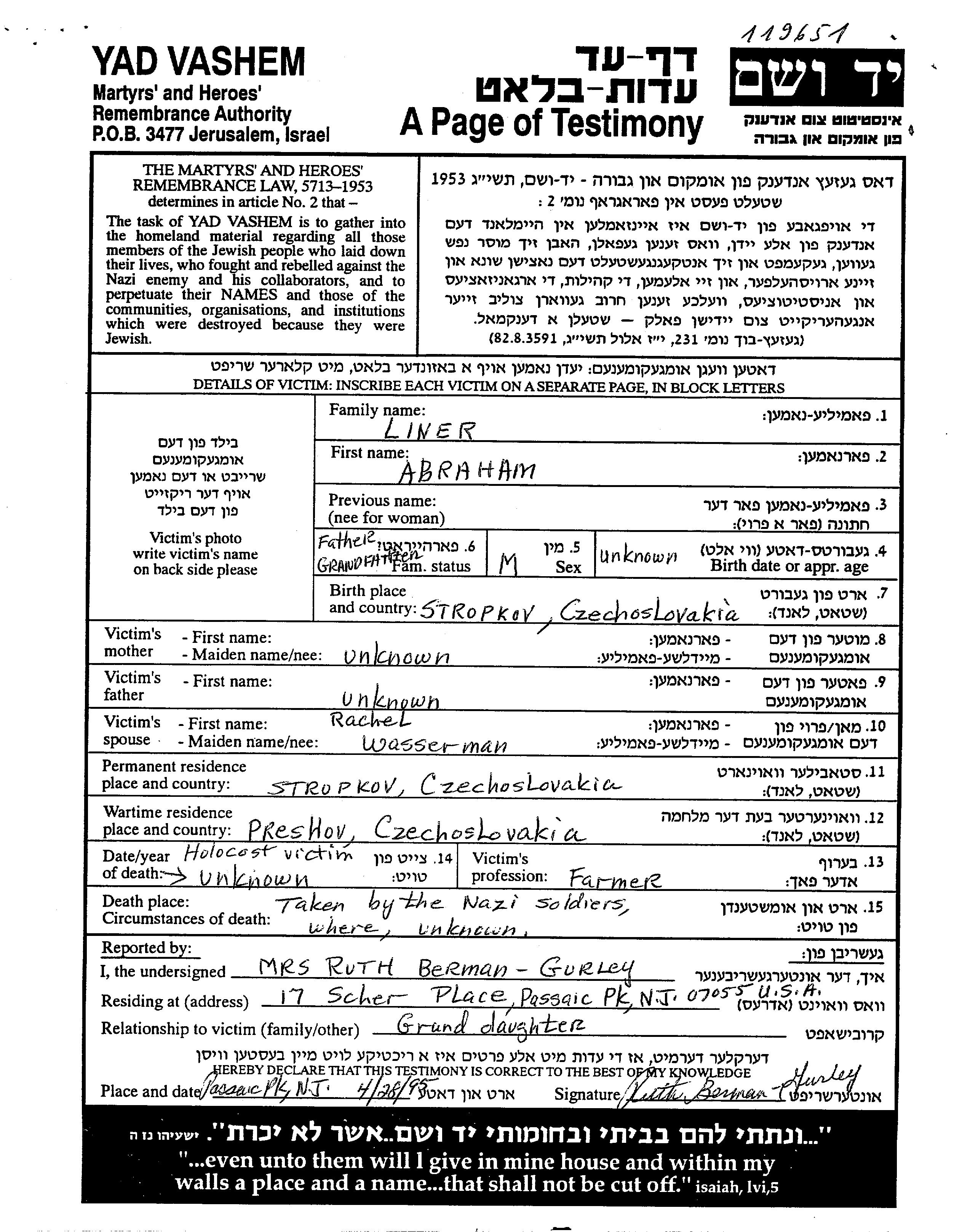 Abraham Liner est né à Stropkov, Tchécoslovaquie. Il était Propriétaire terrien et Mariée à Rachel. Avant la seconde guerre mondiale il vivait à Stropkov, Tchécoslovaquie. Au cours de la guerre, il était à Presov, Tchécoslovaquie.