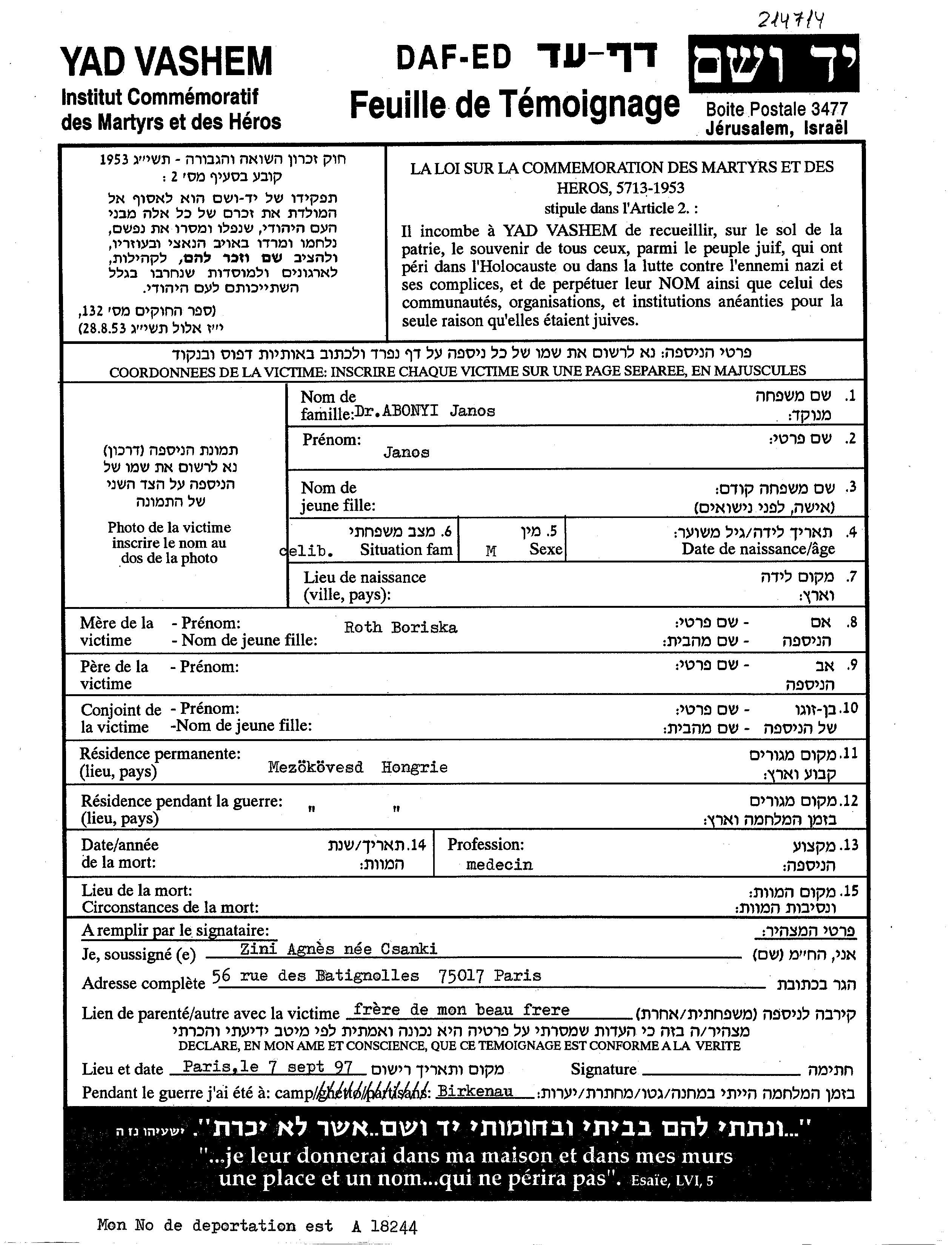 Dr. Janos Abonyi est né fils de Borbala née Roth. Il était Médecin et Célibataire. Avant la seconde guerre mondiale il vivait à Mezokovesd, Hongrie. Au cours de la guerre, il était à Mezokovesd, Hongrie.