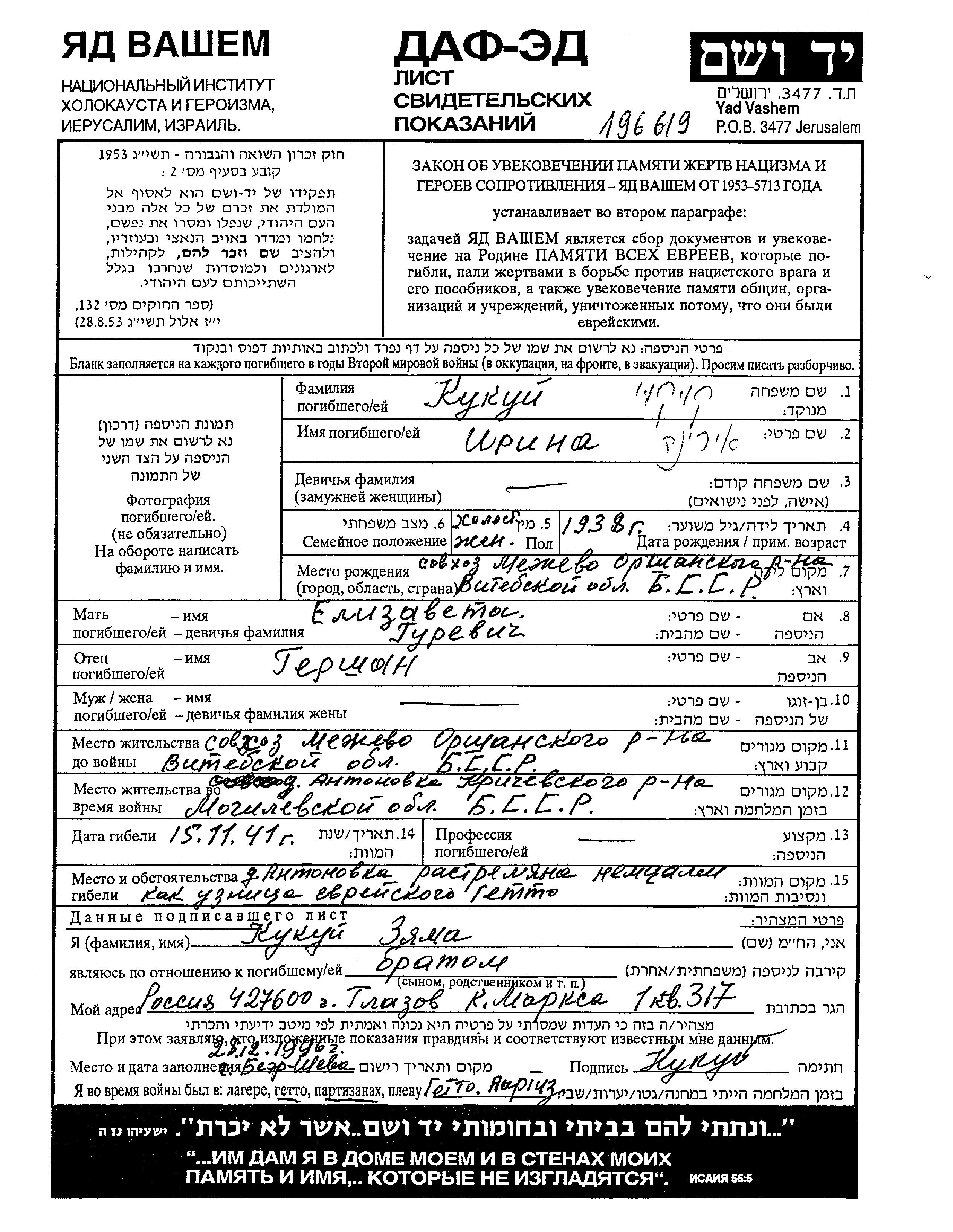 Kukui Irina 1938 Mezhevo, Bélorussie (URSS) Feuille de témoignage