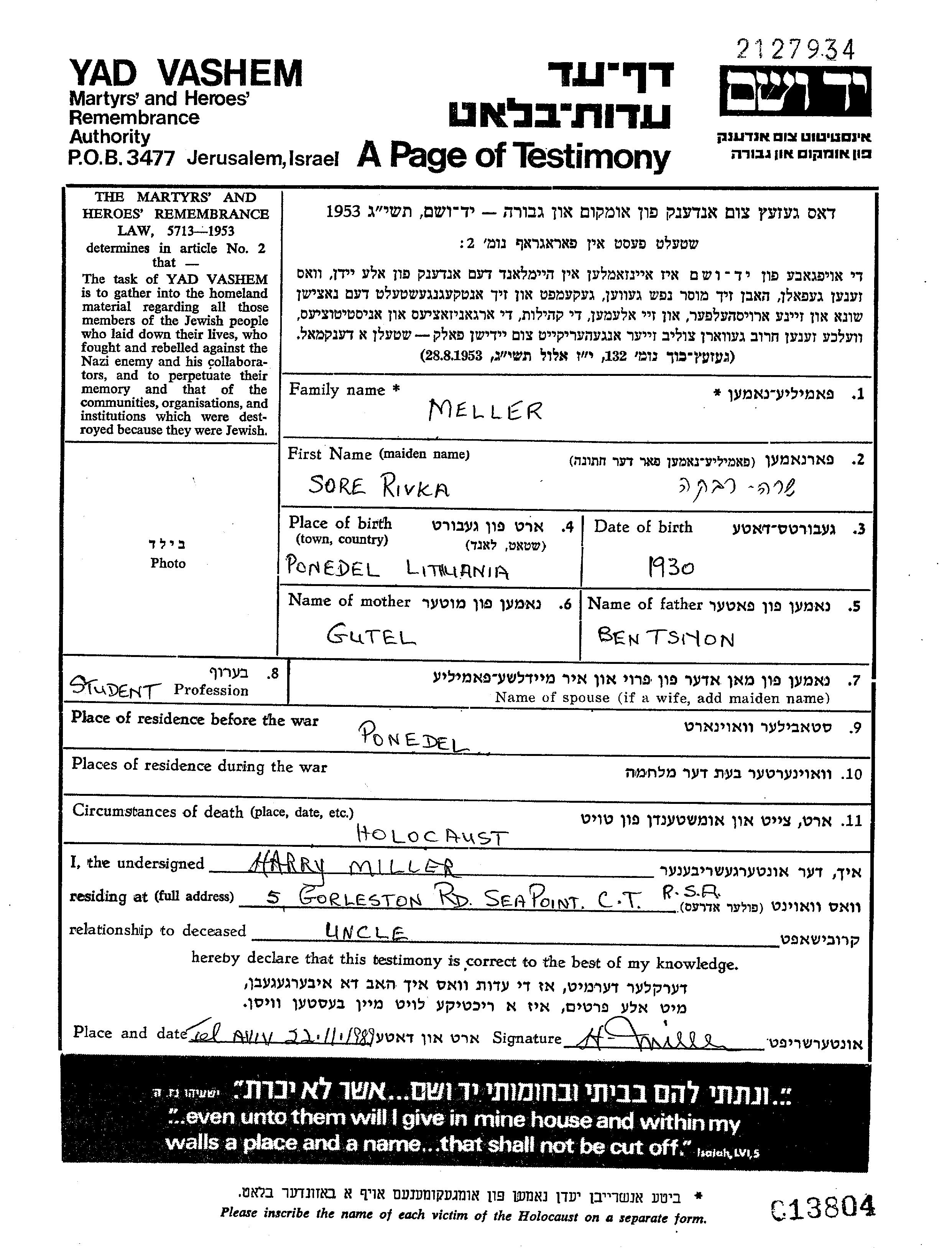 Meller Maler Sore Rivka 1930 Ponidel, Lituanie Feuille de témoignage