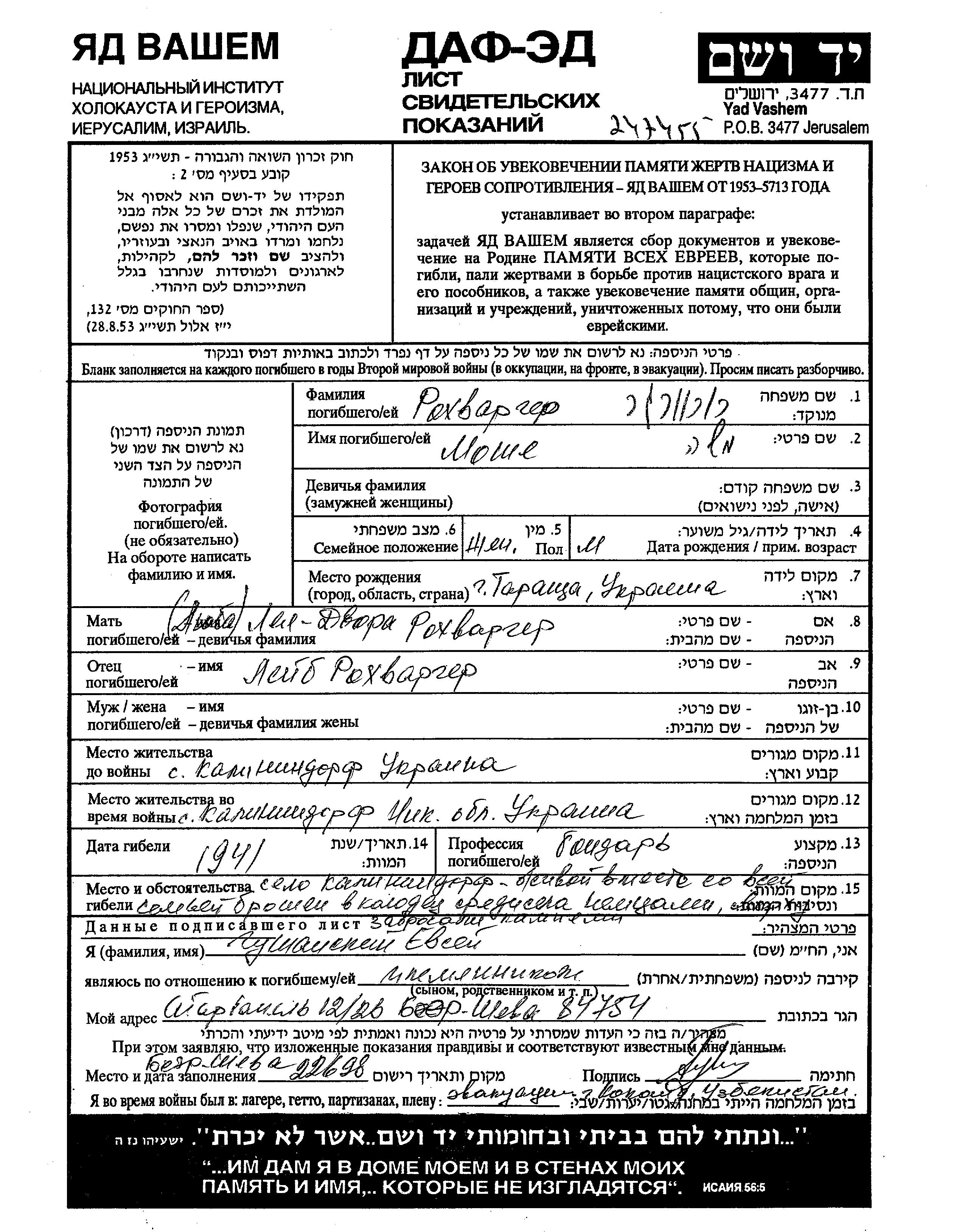 Rokhvarger Moshe Kalinindorf, Ukraine (URSS) Feuille de témoignage