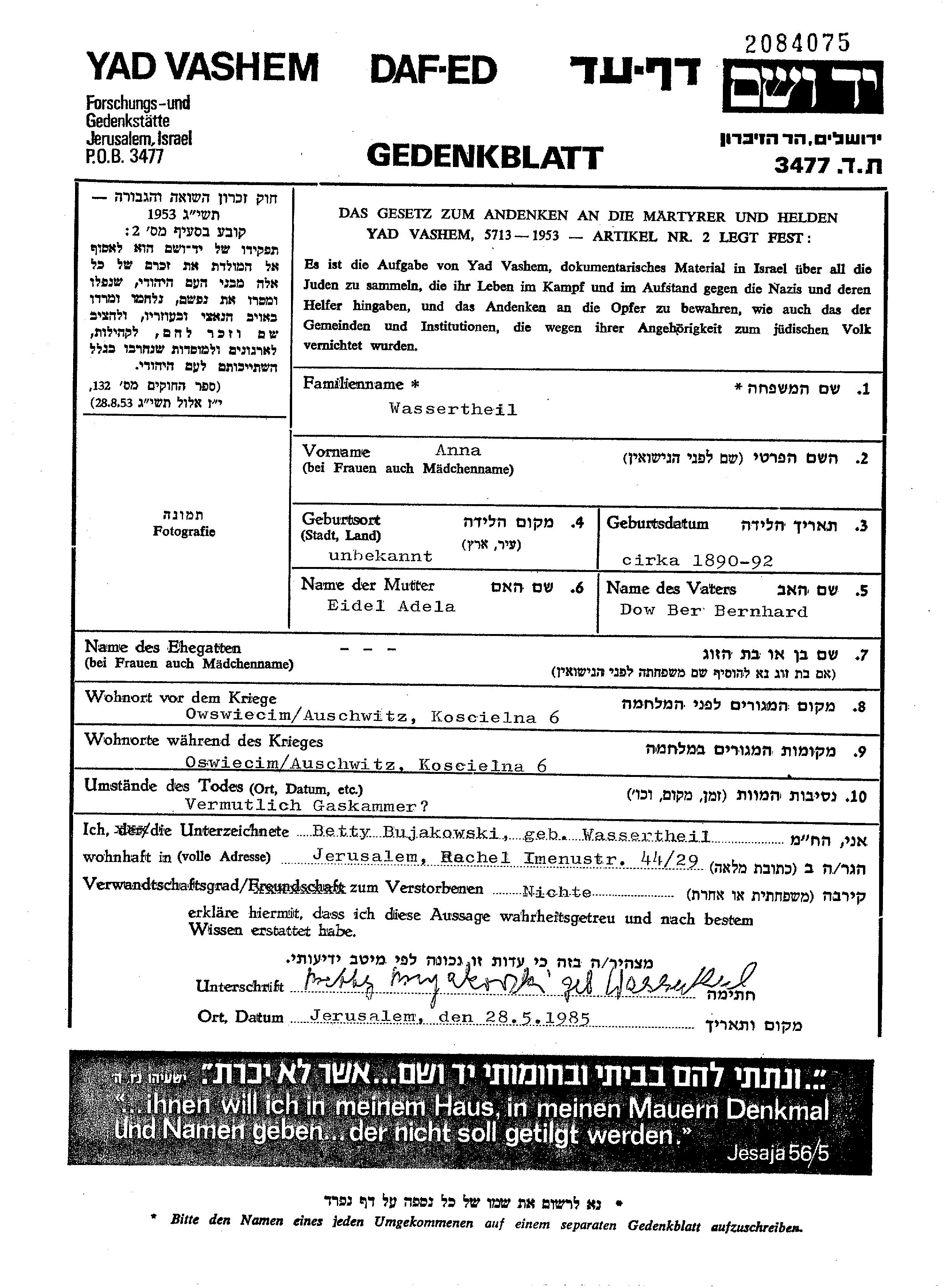 Wassertheil Anna 1890 Oświęcim, Pologne Feuille de témoignage