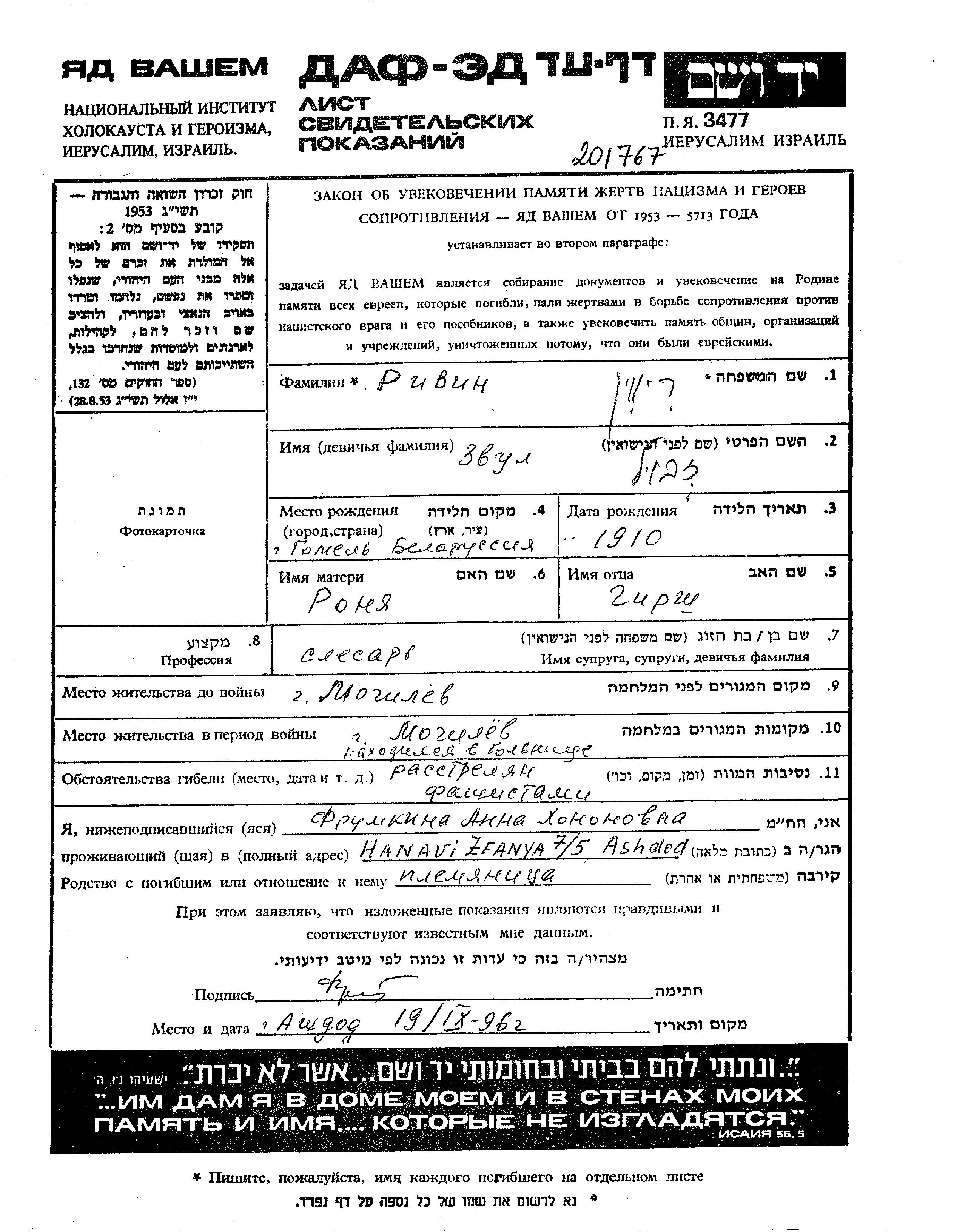 Rivin Zvul Zavul 1910 Mogilev, Bélorussie (URSS) Feuille de témoignage