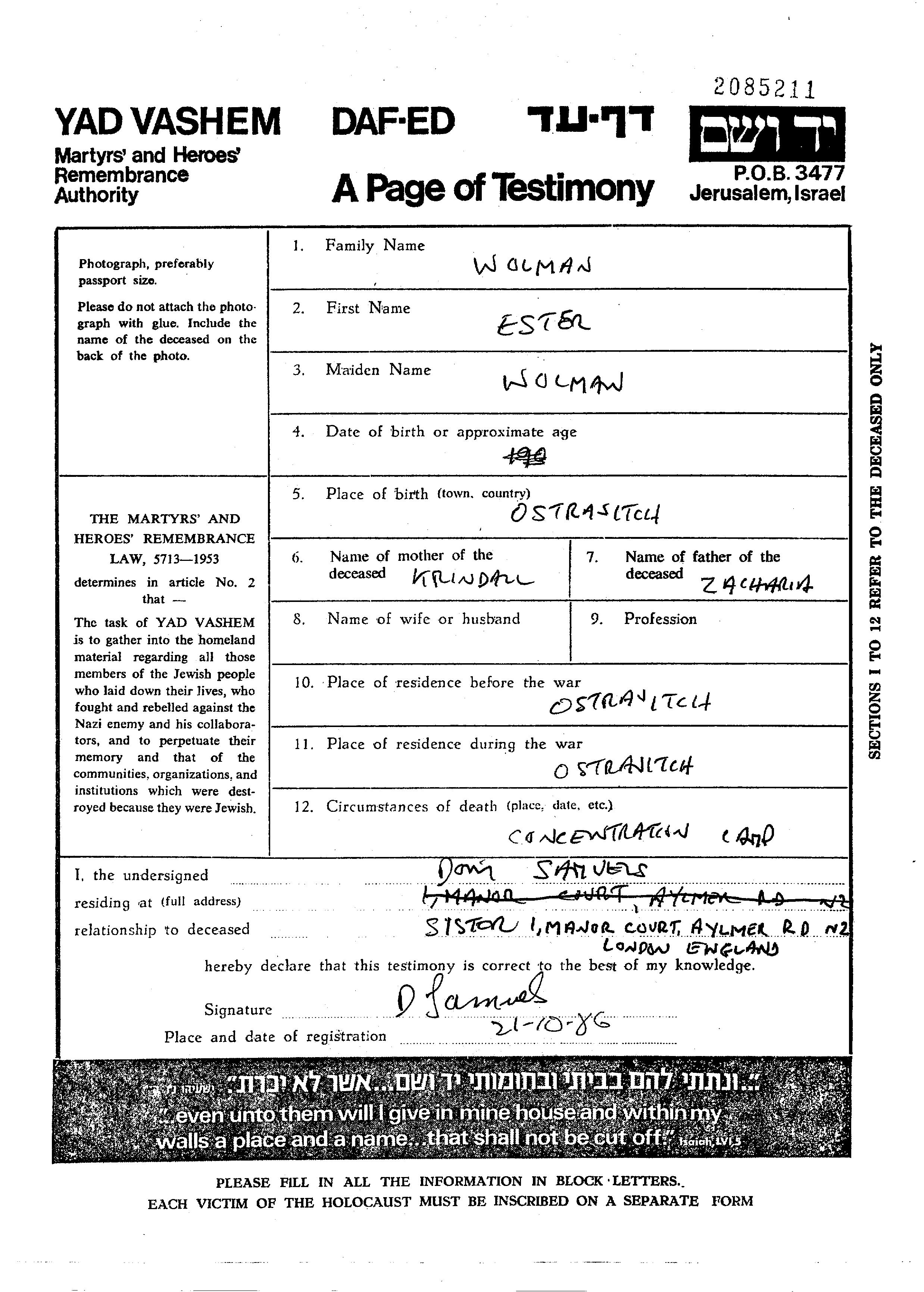 Wolman Ester Ostrowiec, Pologne Feuille de témoignage