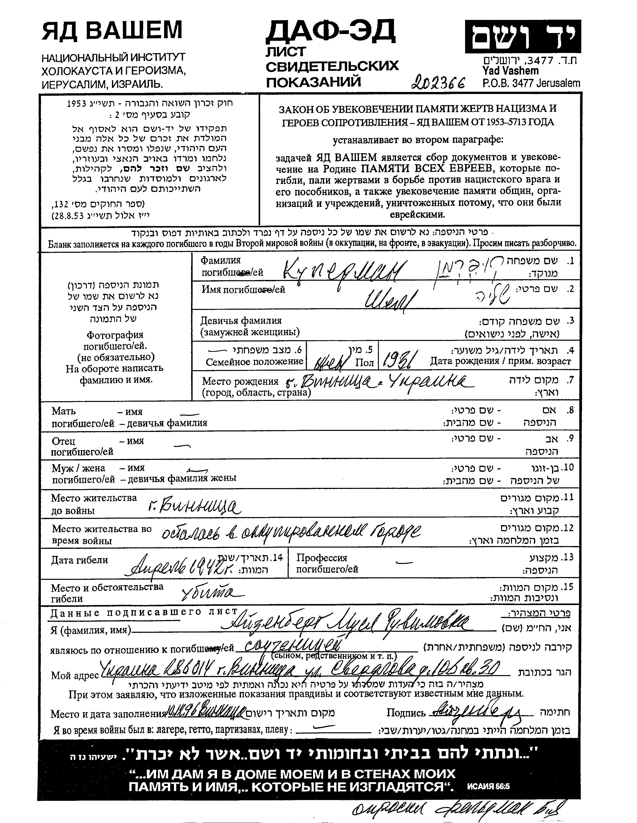 Kuperman Shelya Shalia 1931 Vinnitsa, Ukraine (URSS) Feuille de témoignage