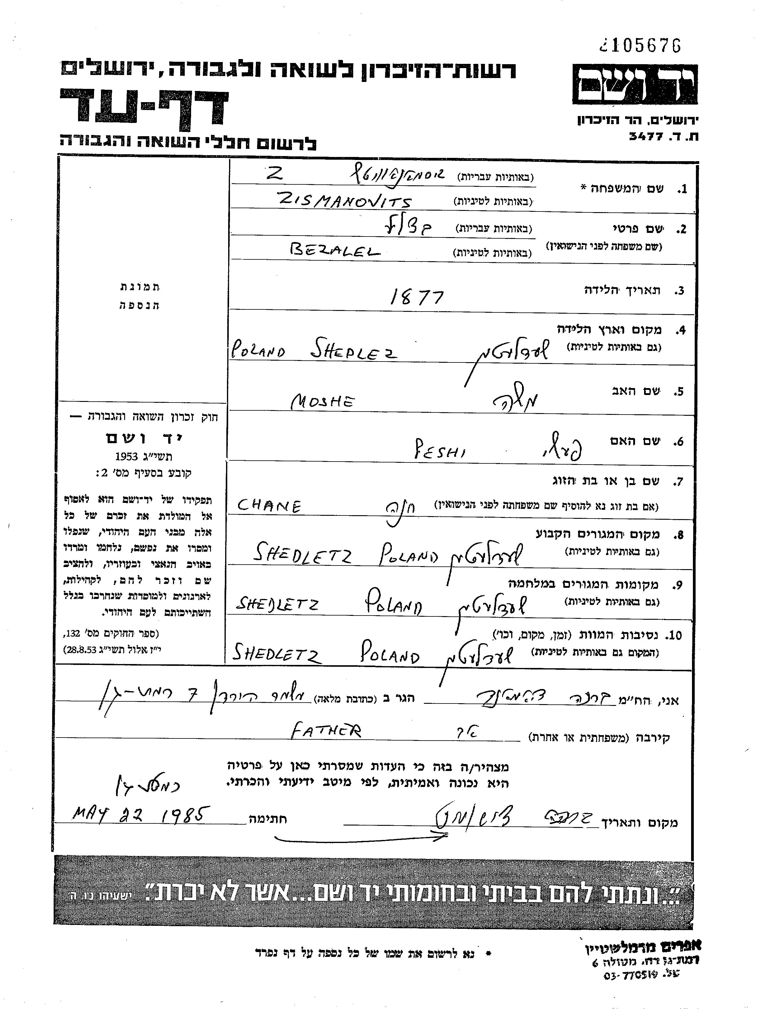 Zismanovits Bezalel Shedlitz, Pologne Feuille de témoignage