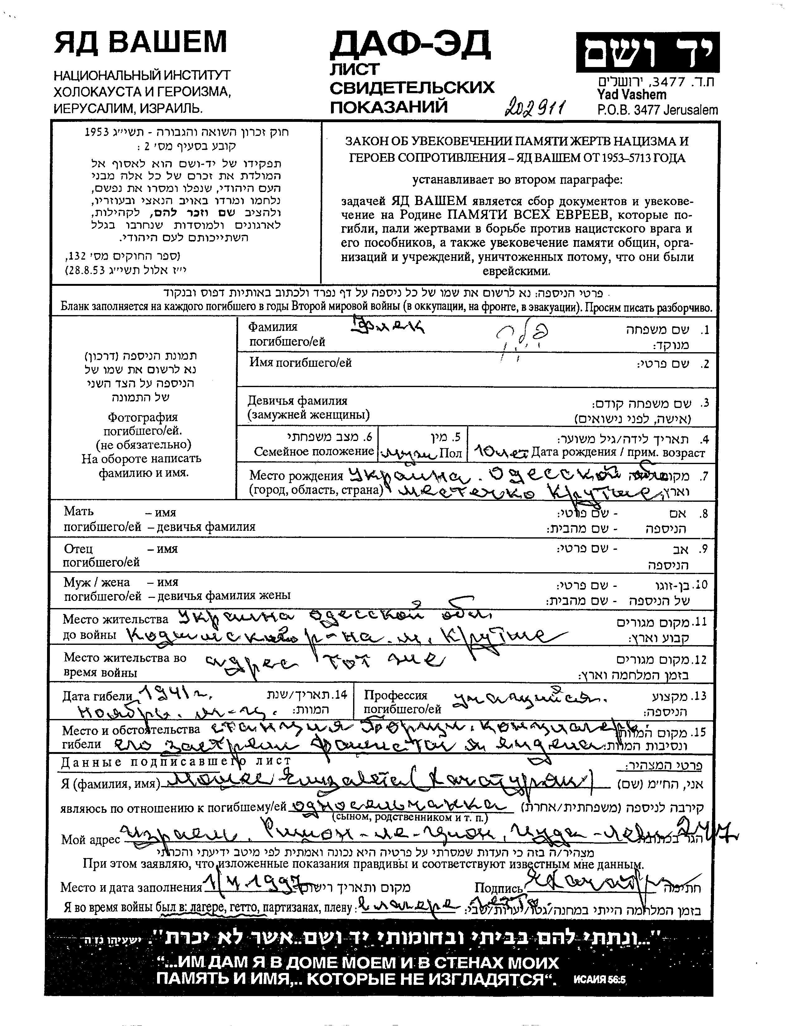 Yad Vashem - Pages of Testimony Names Memorial Collection