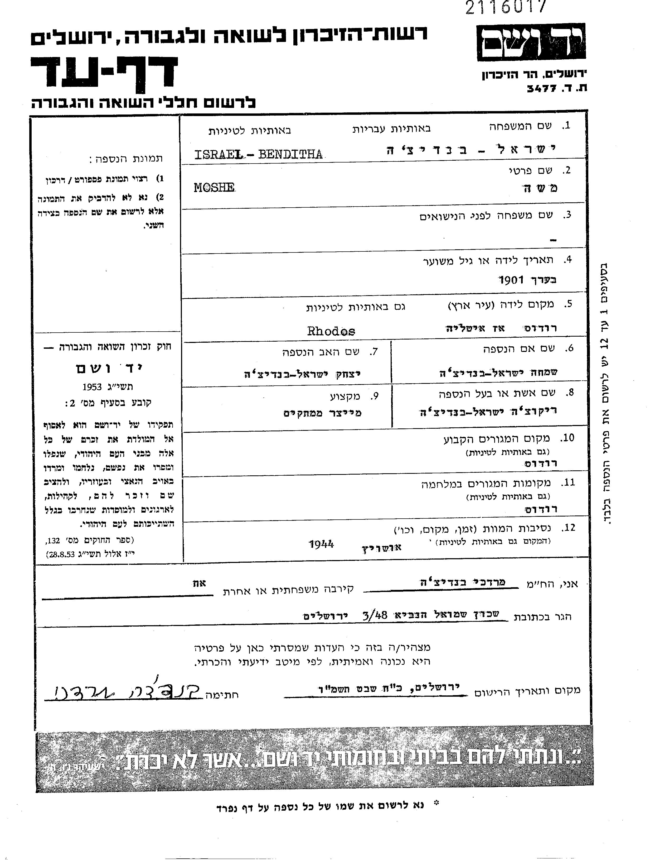 Moshe Israel Benditha est né à Rodi, Italie en 1901, fils de Yitzkhak et de Simkha. Il était Fabricant de bonbons. Avant la seconde guerre mondiale il vivait à Rodi, Italie. Au cours de la guerre, il était à Rodi, Italie.