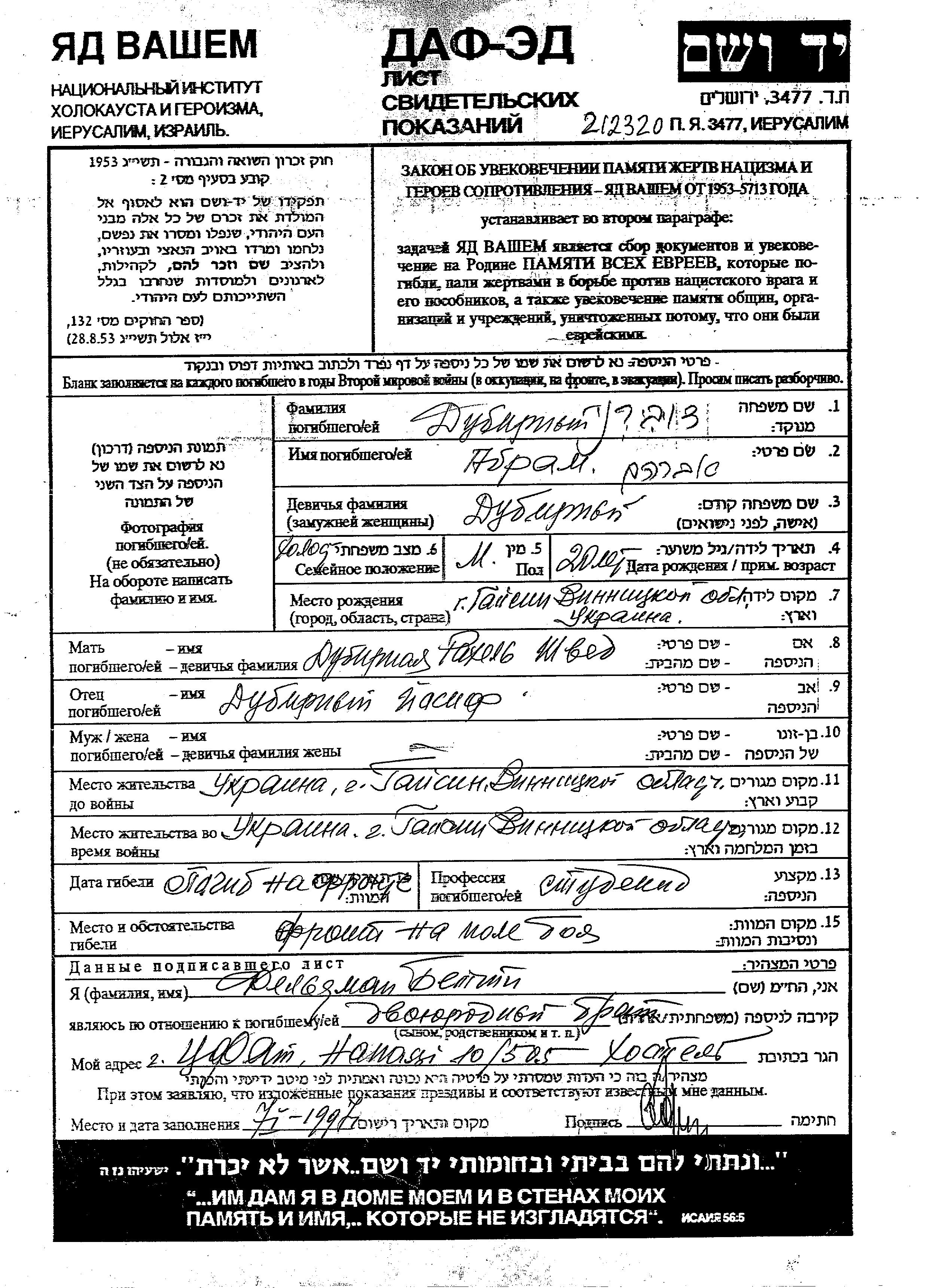 Dubirny Abram Gaysin, Ukraine (URSS) Feuille de témoignage