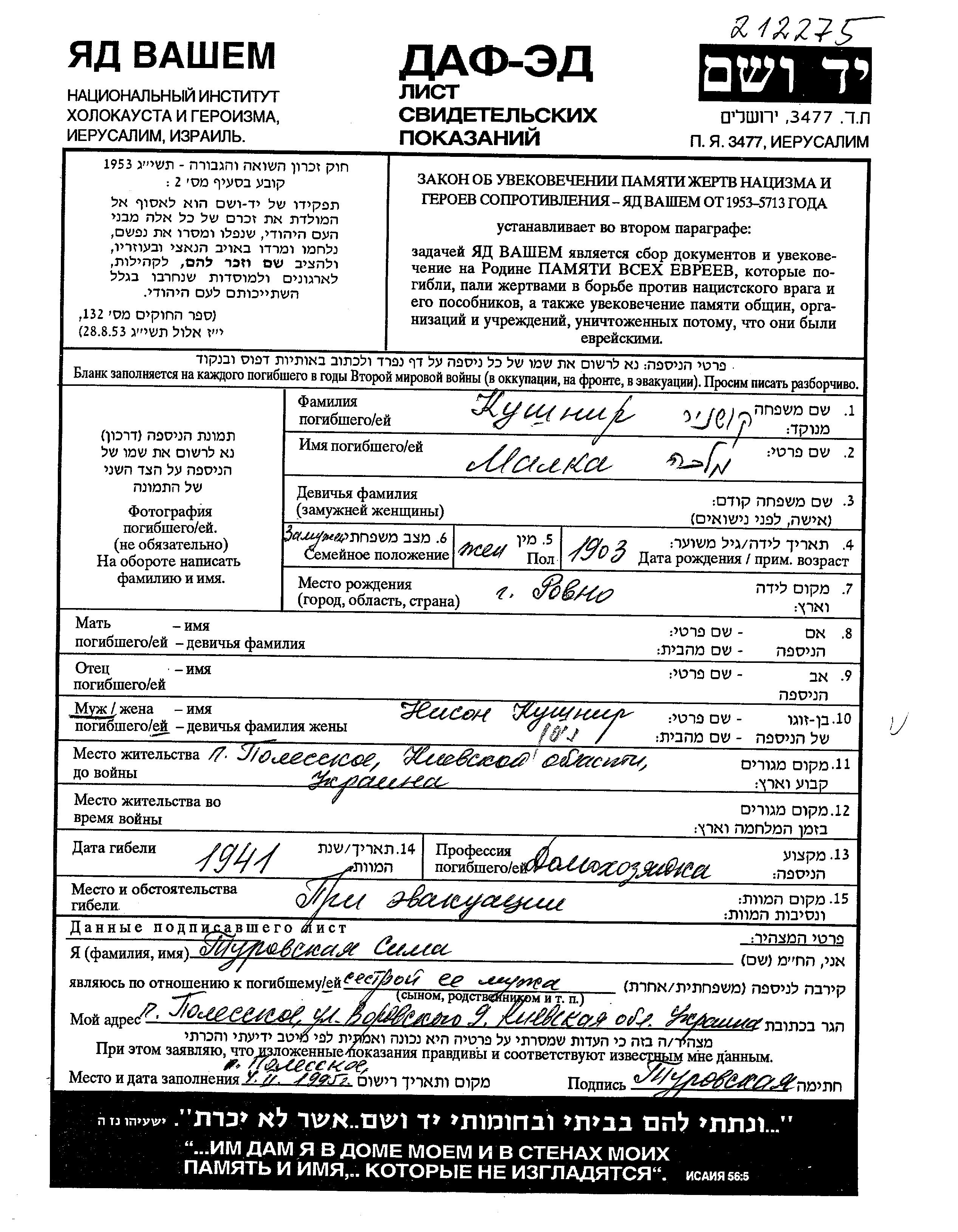 Kushnir Malka 1903 Polesskoye, Ukraine (URSS) Feuille de témoignage