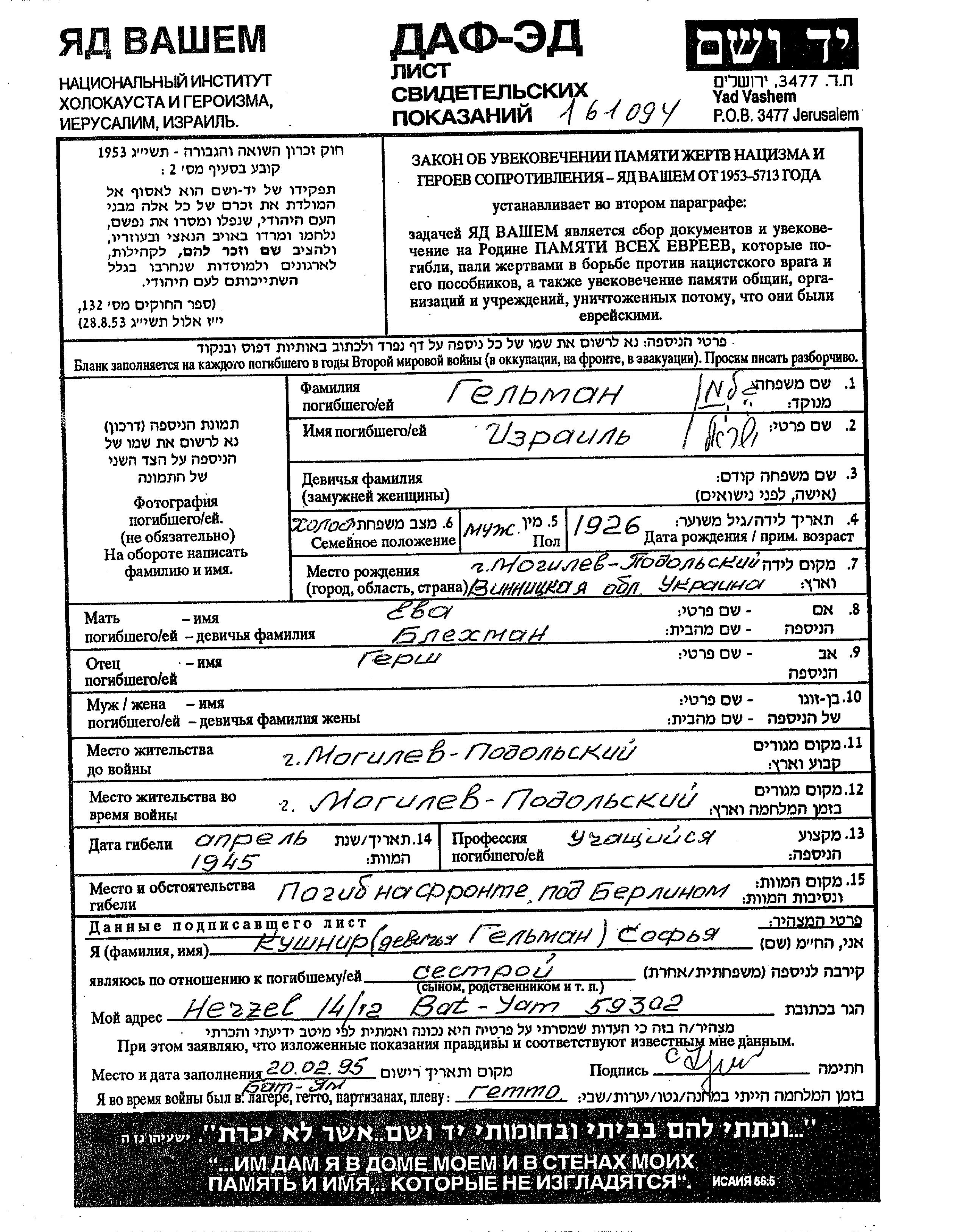 Gelman Izrail 1926 Mogilev Podolski, Ukraine (URSS) Feuille de témoignage