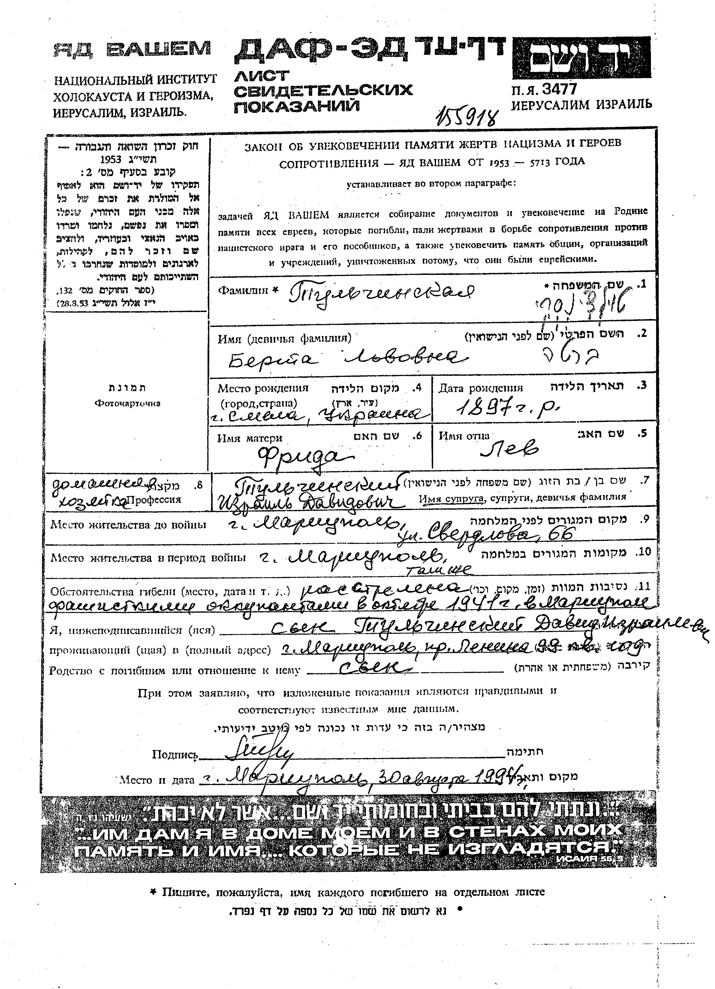 Tulchinski Berta 1897 Mariupol, Ukraine (URSS) Feuille de témoignage