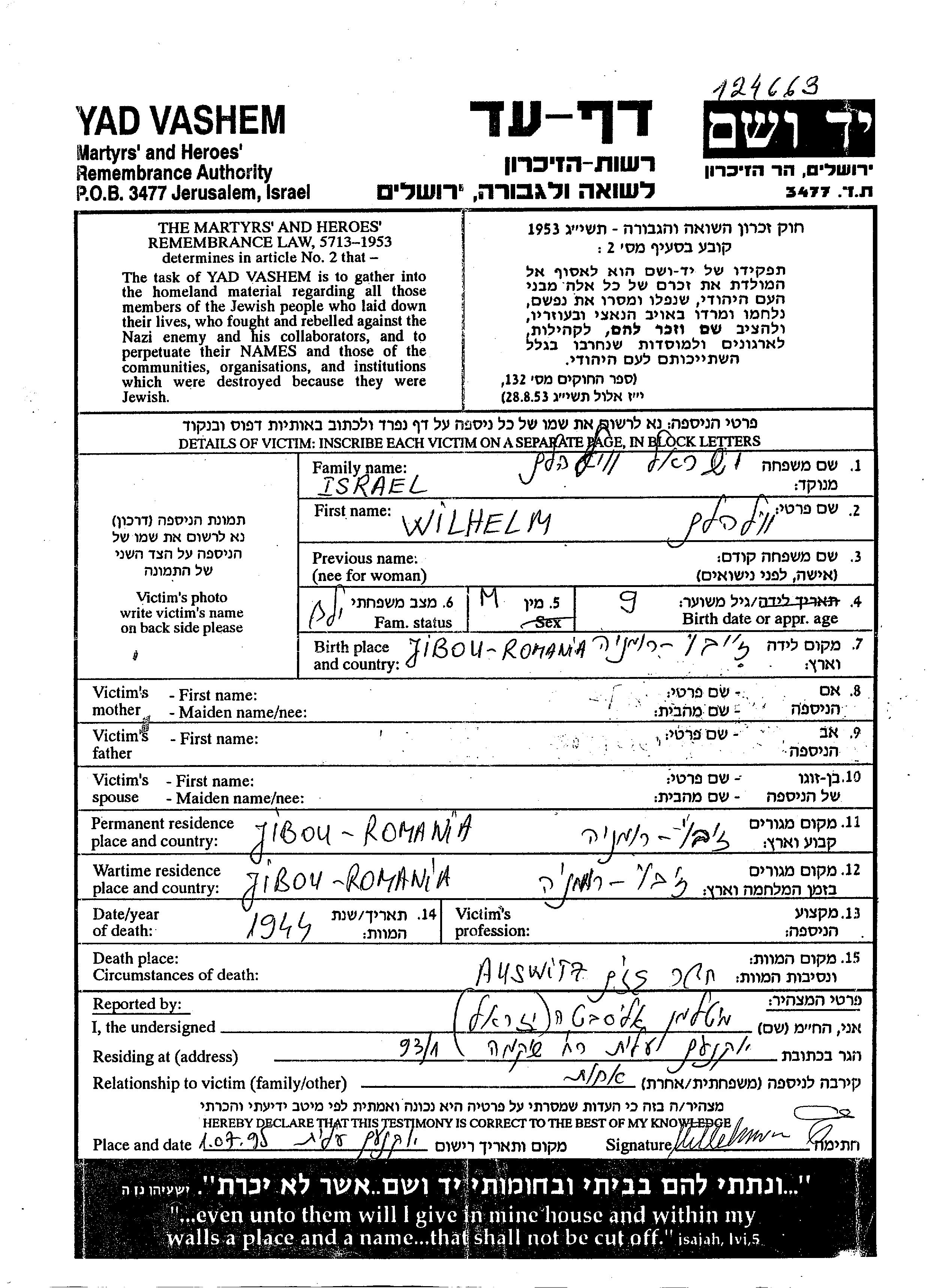 Wilhelm Israel est né à Jibou, Roumanie en 1935, fils de Herman et de Rakhel. Il était Enfant. Avant la seconde guerre mondiale il vivait à Jibou, Roumanie. Au cours de la guerre, il était à Jibou, Roumanie.