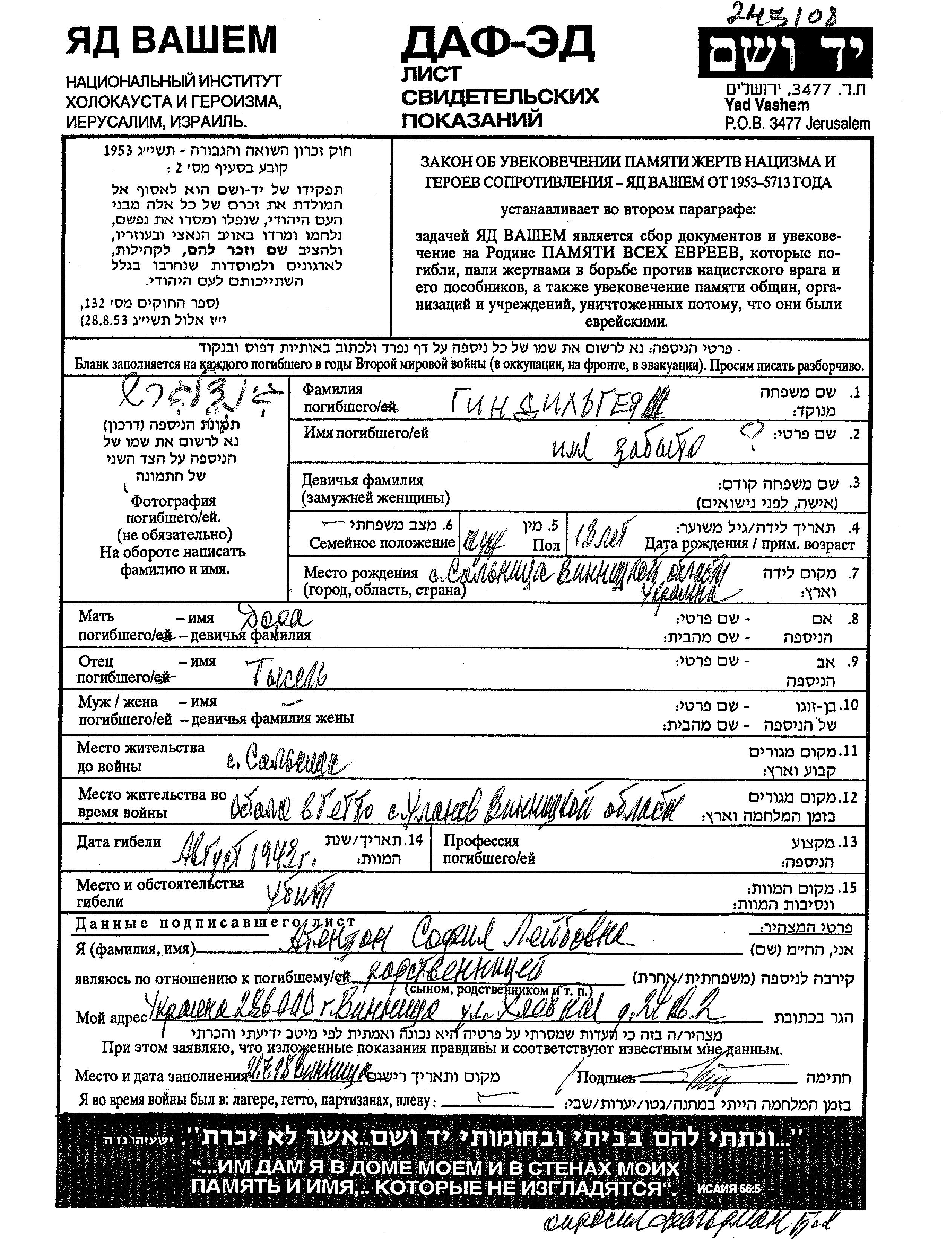 Gindilgersh prénom inconnu 1930 Salnitsa, Ukraine (URSS) Feuille de témoignage