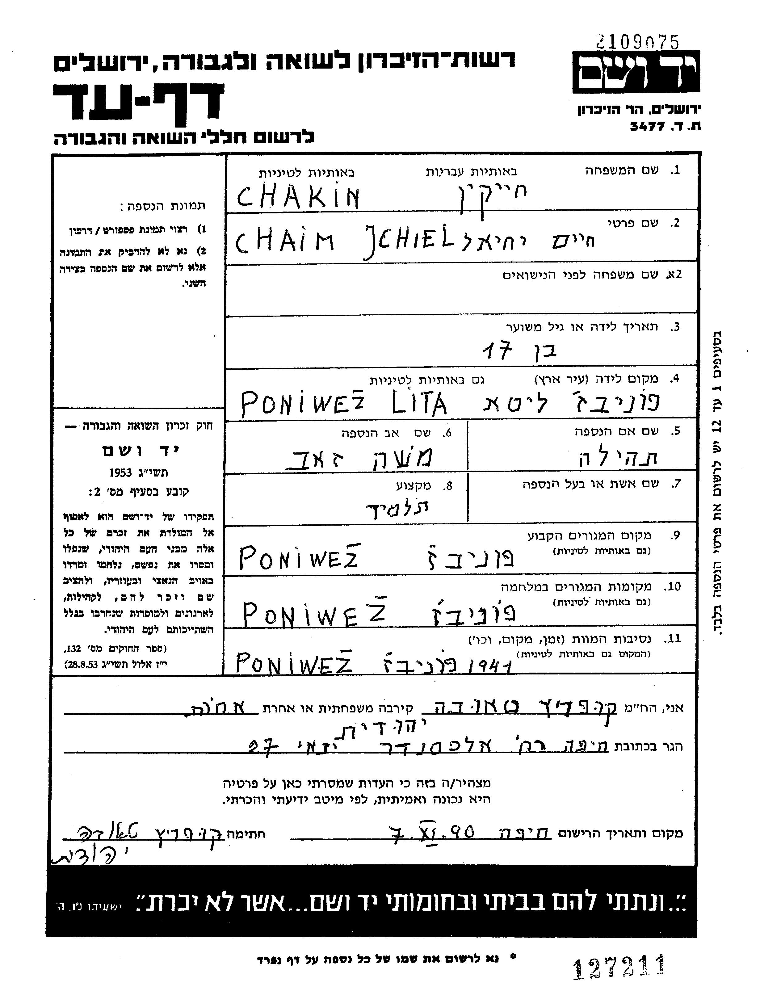 Chaikin Chakin Khaikin Chaim Jehiel 1924 Ponivez, Lituanie Feuille de témoignage