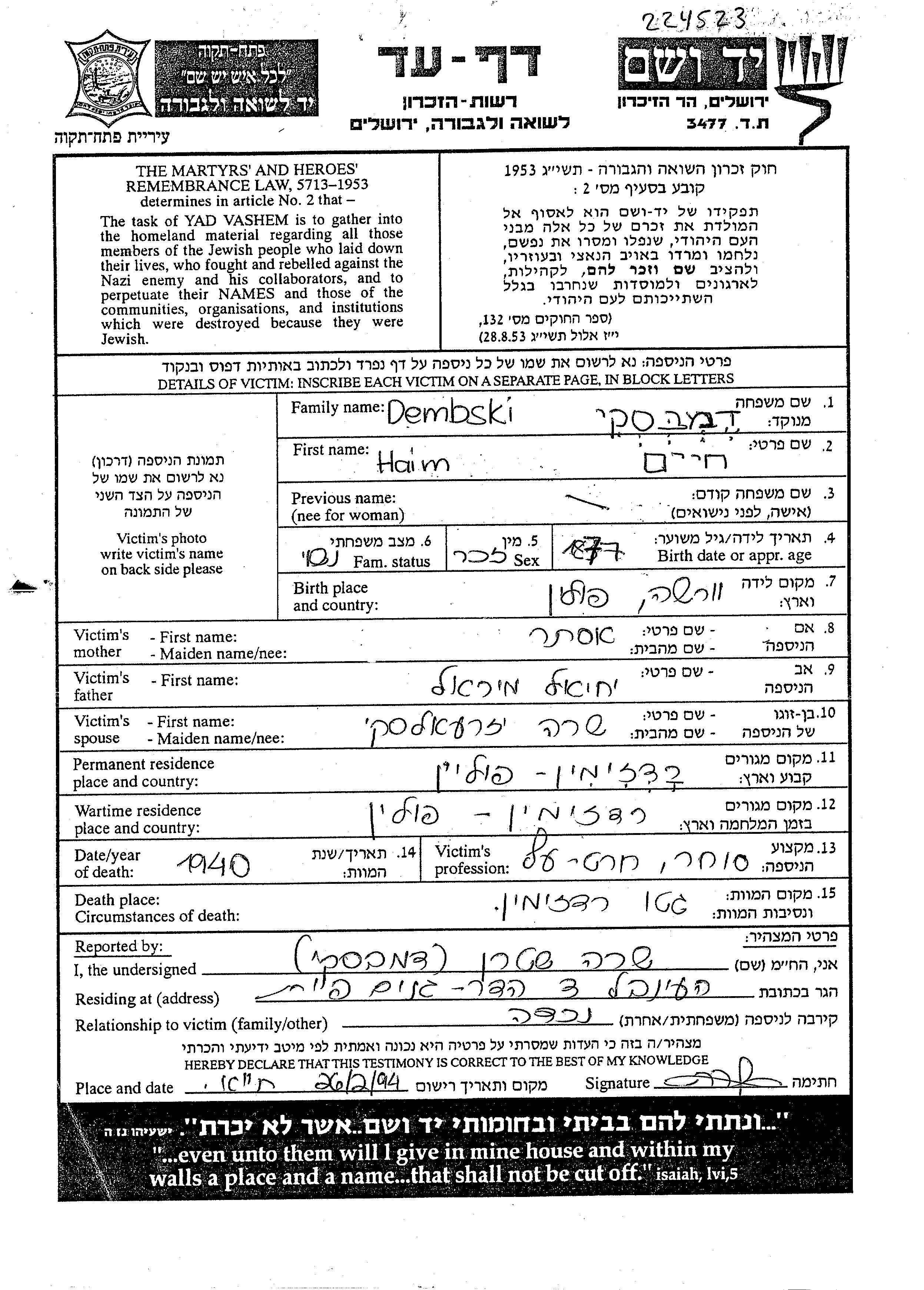 Dembski Haim 1877 Radzymin, Pologne Feuille de témoignage
