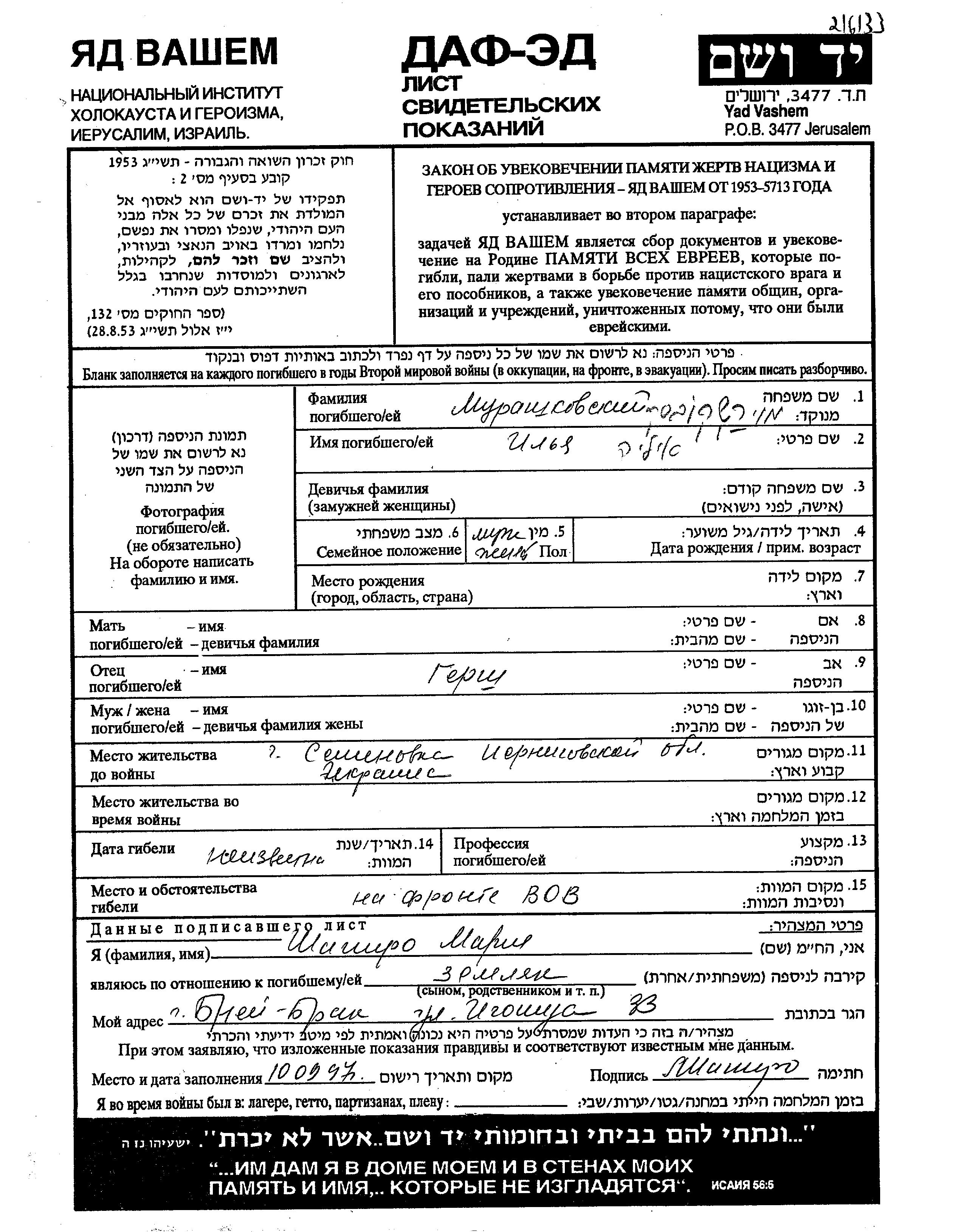 Ilya Murashkovski est né fils de Gersh. Avant la seconde guerre mondiale il vivait à Semenovka, Ukraine (URSS). Ilya a été tué en tant que militaire pendant la Seconde Guerre mondiale.