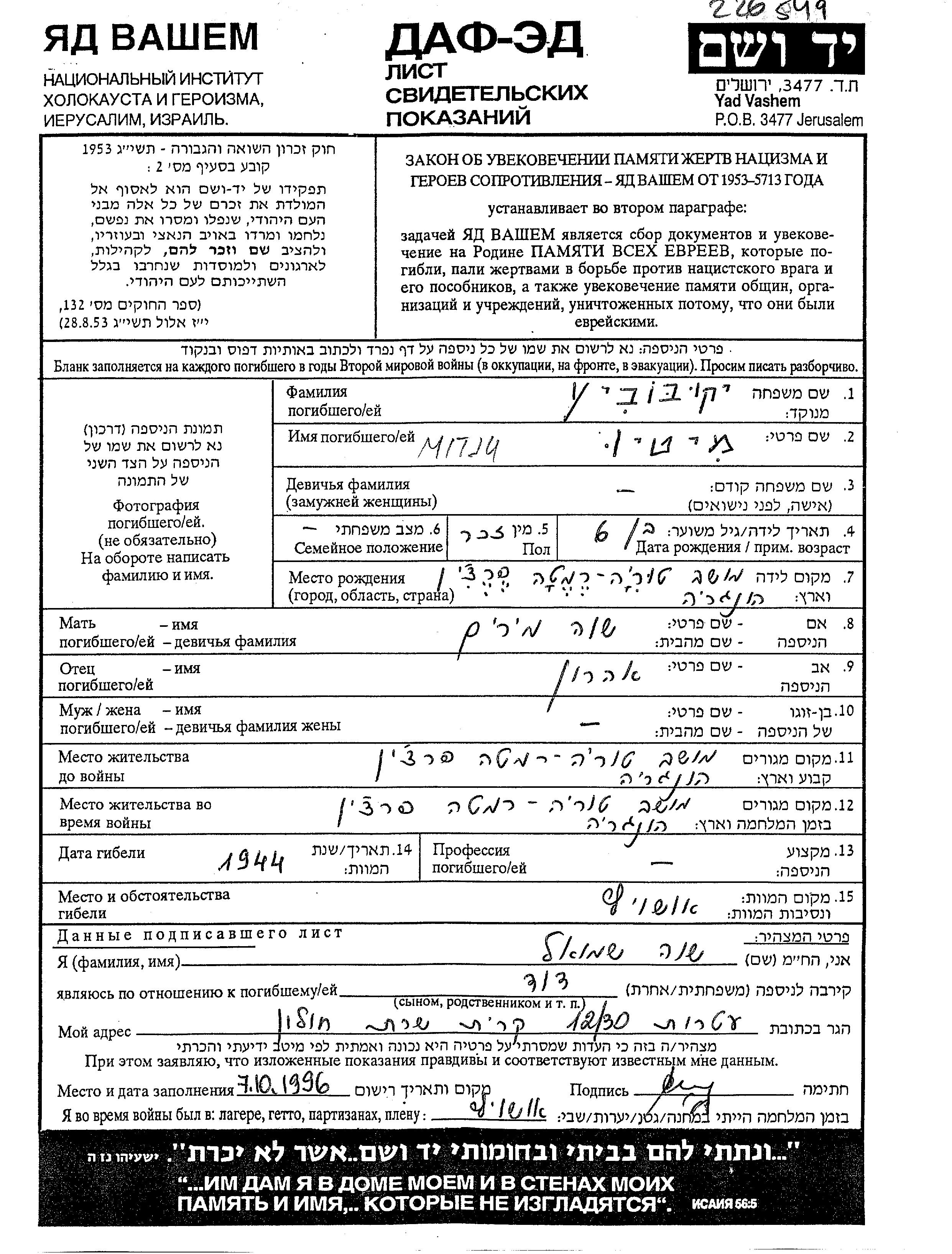 Yad Vashem - Pages of Testimony Names Memorial Collection