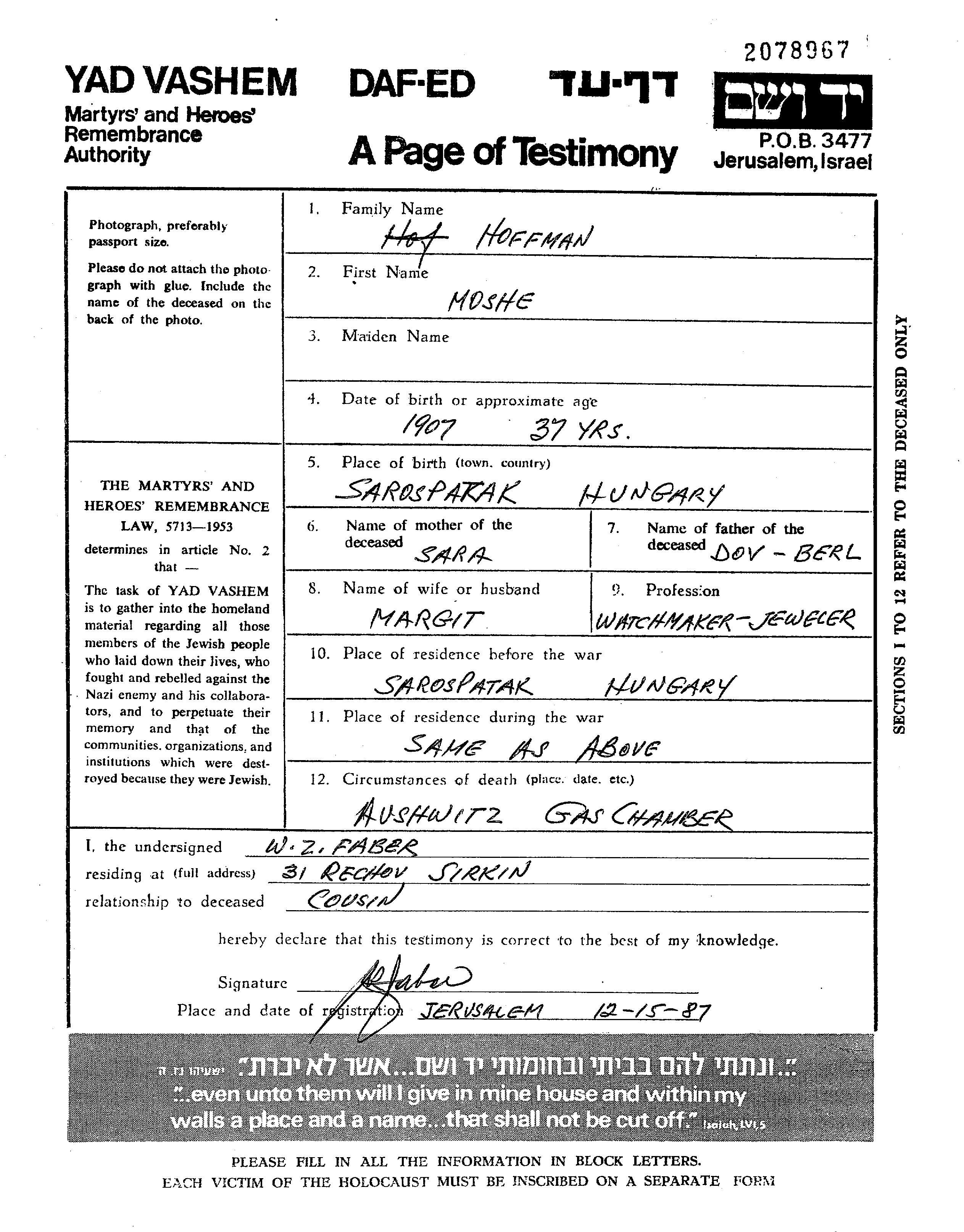 Hoffman Moshe Sarospatak, Hongrie Feuille de témoignage