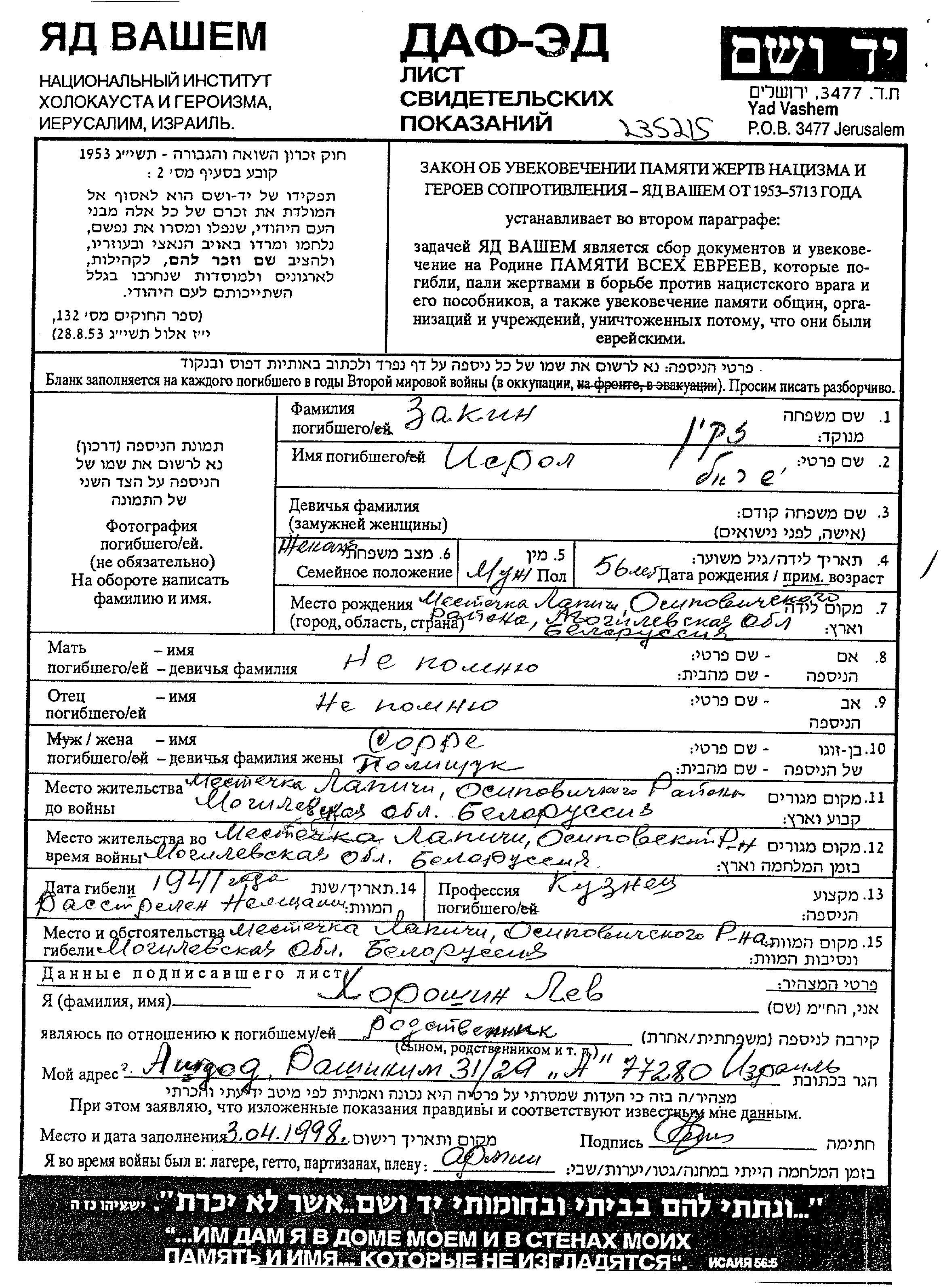 Isrol Zakin est né à Lapichi, Bélorussie (URSS) en 1885. Il était Forgeron et Mariée à Sorel. Avant la seconde guerre mondiale il vivait à Lapichi, Bélorussie (URSS). Au cours de la guerre, il était à Lapichi, Bélorussie (URSS).