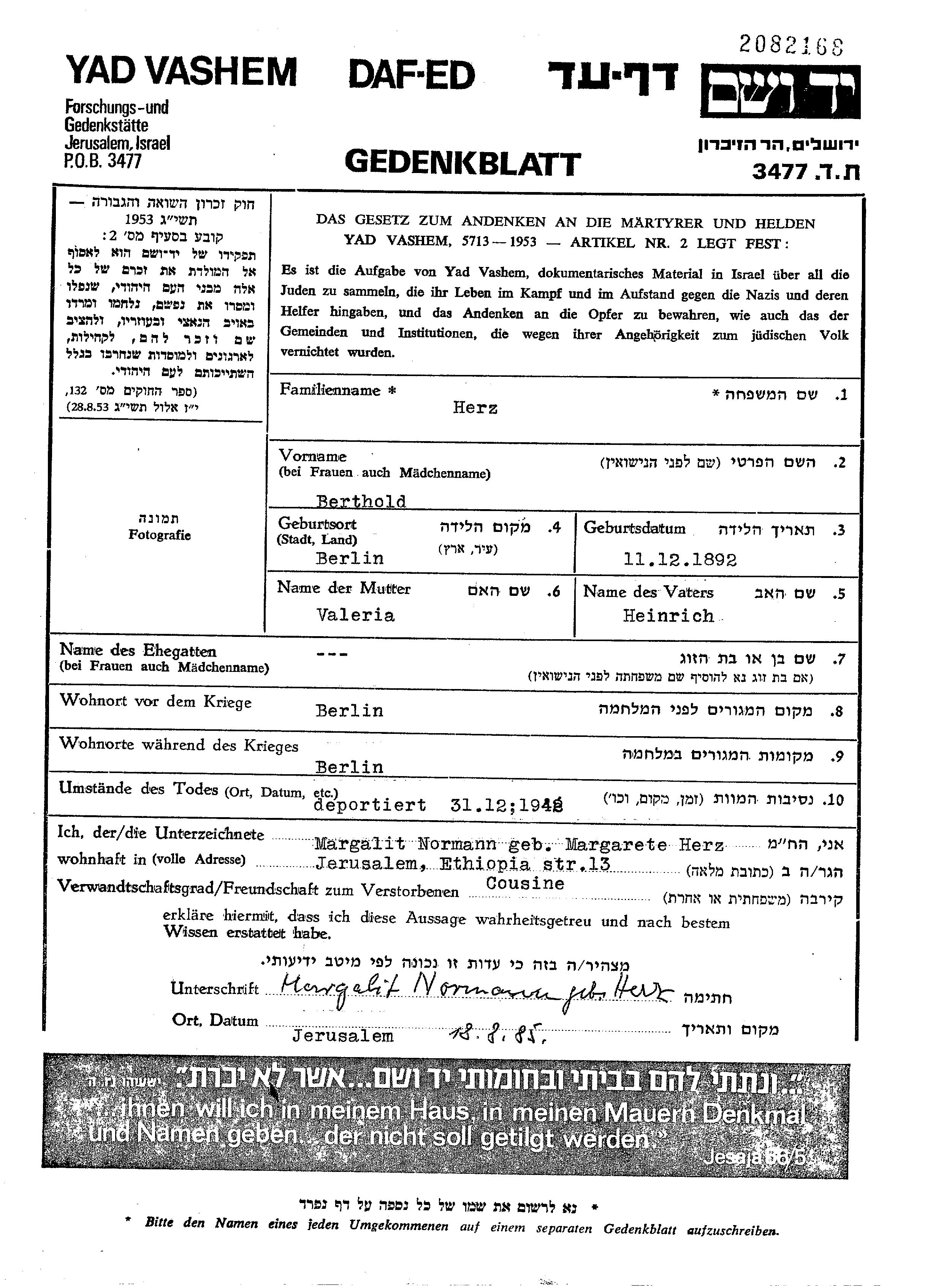 Berthold Herz est né à Berlin, Allemagne en 1892, fils de Heinrich et de Valeria. Avant la seconde guerre mondiale il vivait à Berlin, Allemagne. Au cours de la guerre, il était à Berlin, Allemagne.