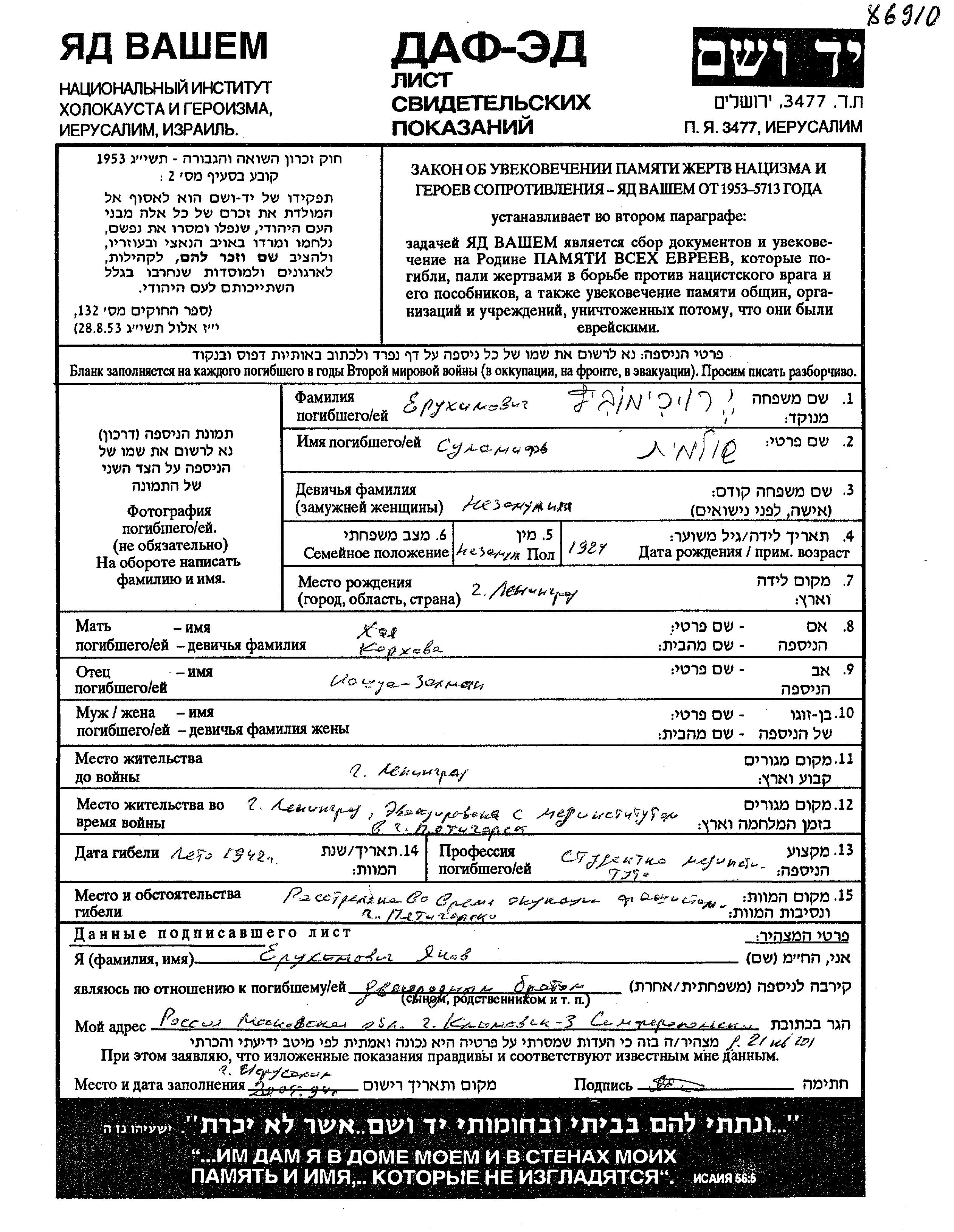 Yerukhimovich Sulamif 1924 Leningrad, Russie (URSS) Feuille de témoignage