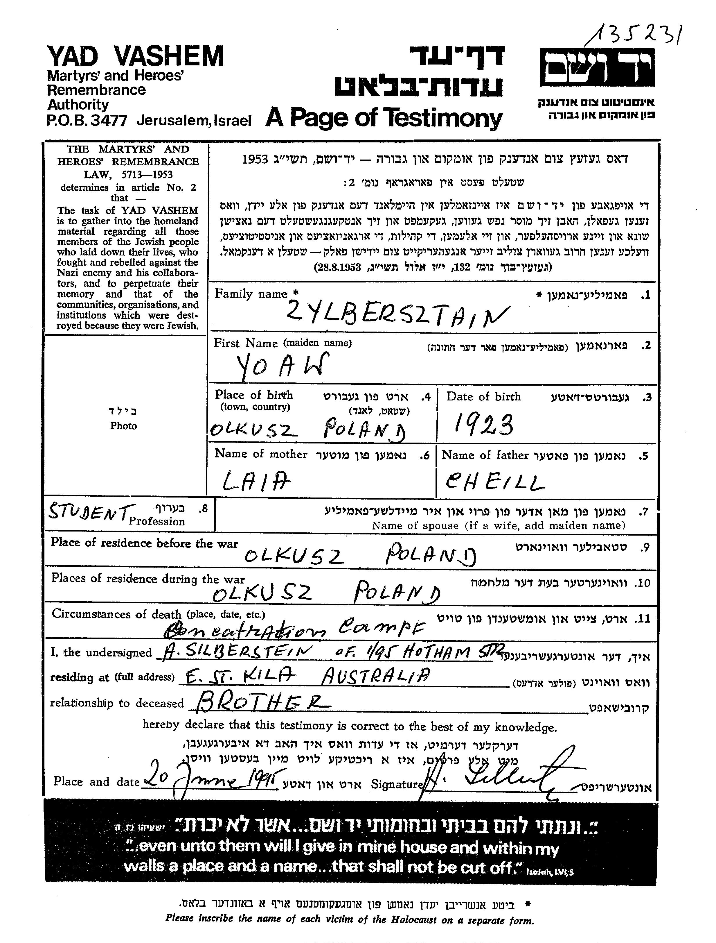 Zylbersztain Yoaw 1923 Olkusz, Pologne Feuille de témoignage
