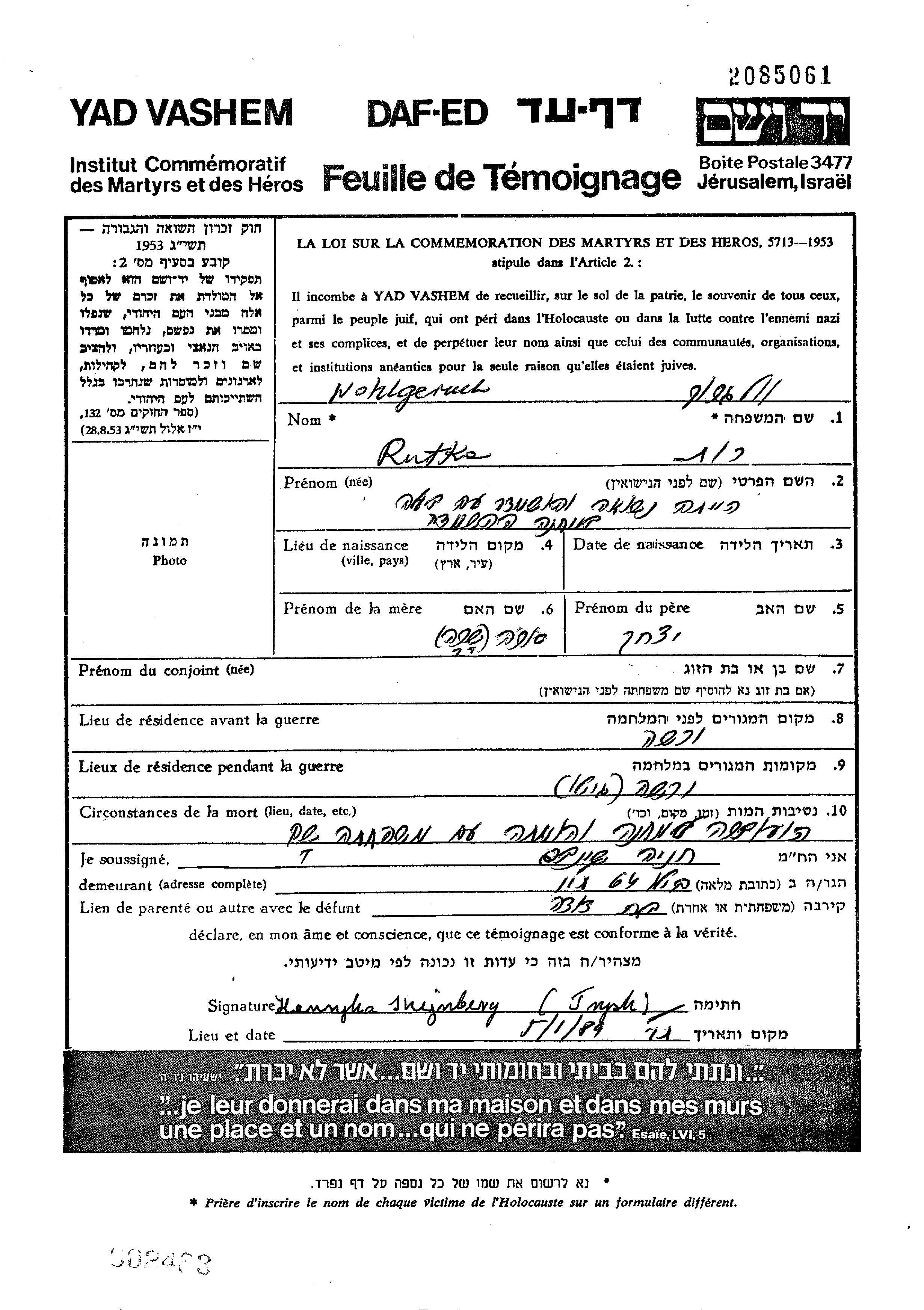 Yad Vashem - Pages of Testimony Names Memorial Collection