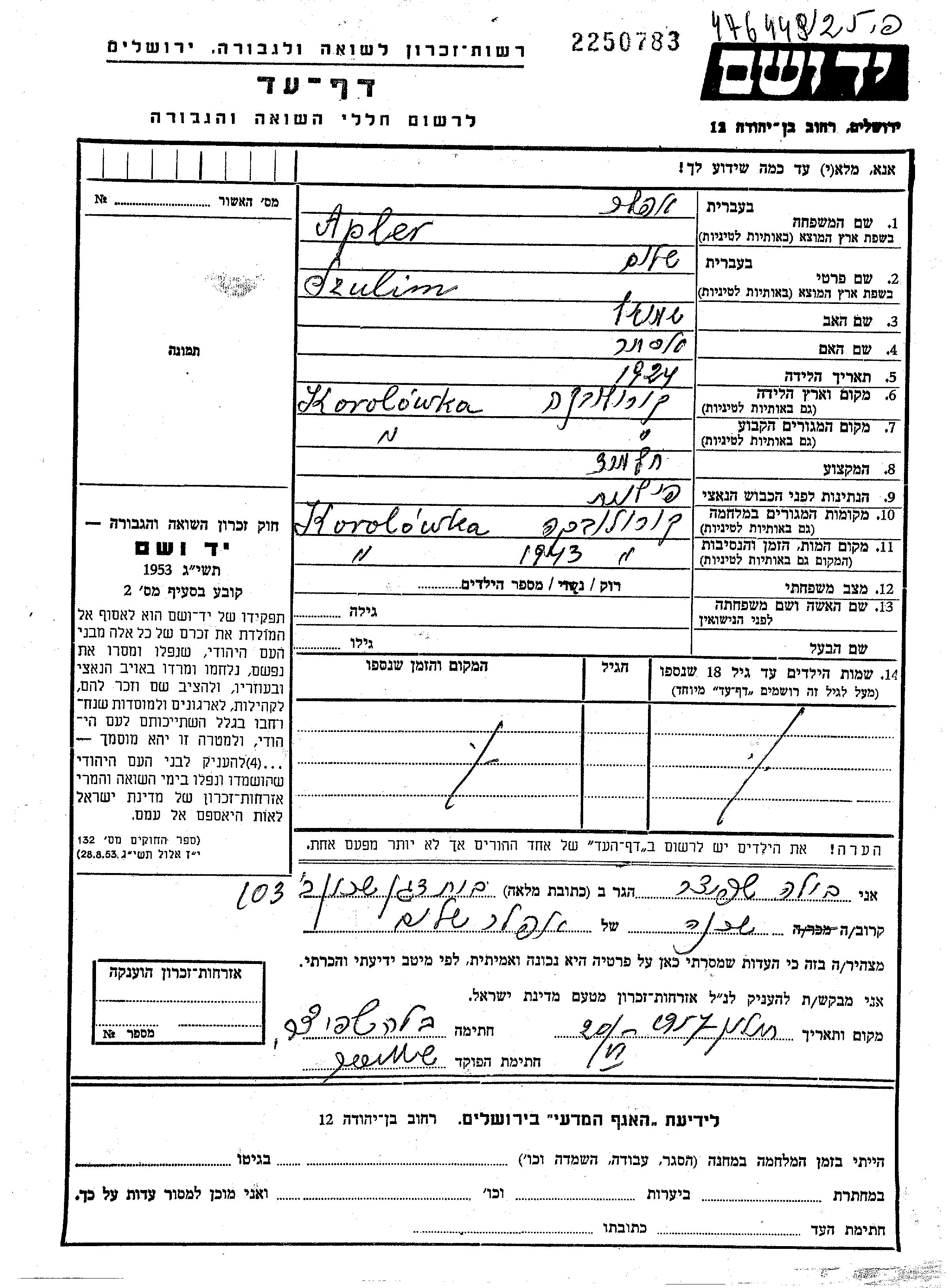 Szulim Apler est né à Korolowka, Pologne en 1924, fils de Szmul et de Estera. Il était Élève et Célibataire. Avant la seconde guerre mondiale il vivait à Korolowka, Pologne. Au cours de la guerre, il était à Korolowka, Pologne.