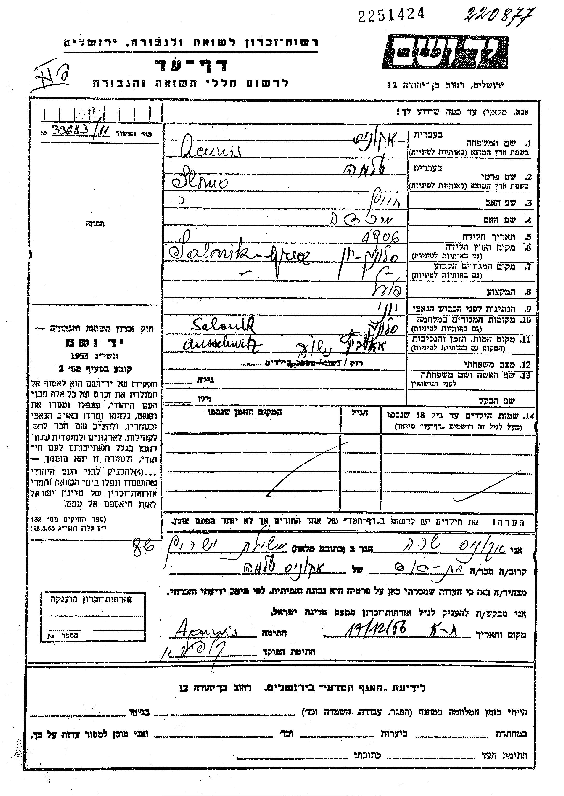 Acunis Slomo 1906 Saloniki, Grèce Feuille de témoignage