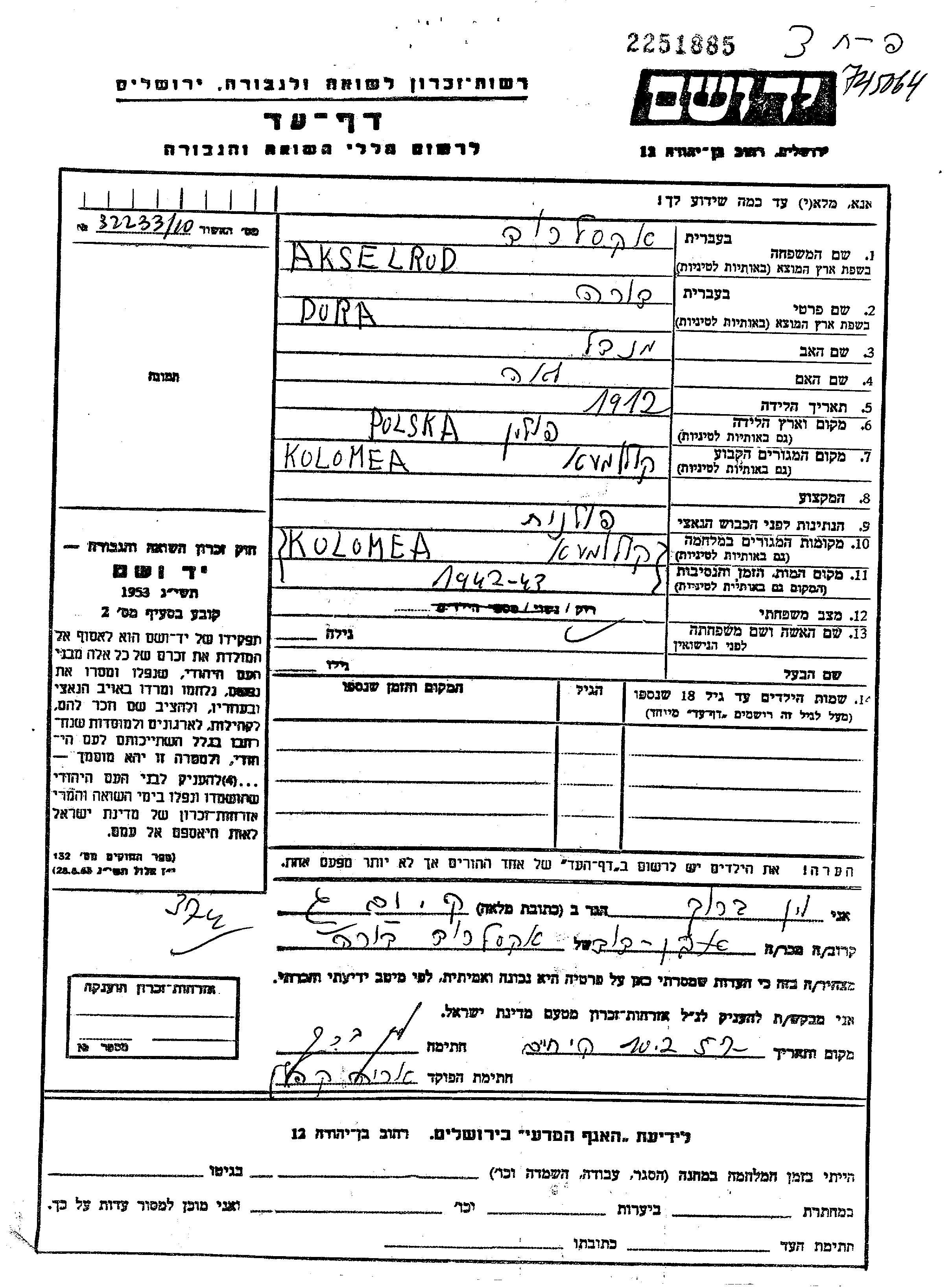 Akselrod Dora 1912 Kolomyja, Pologne Feuille de témoignage