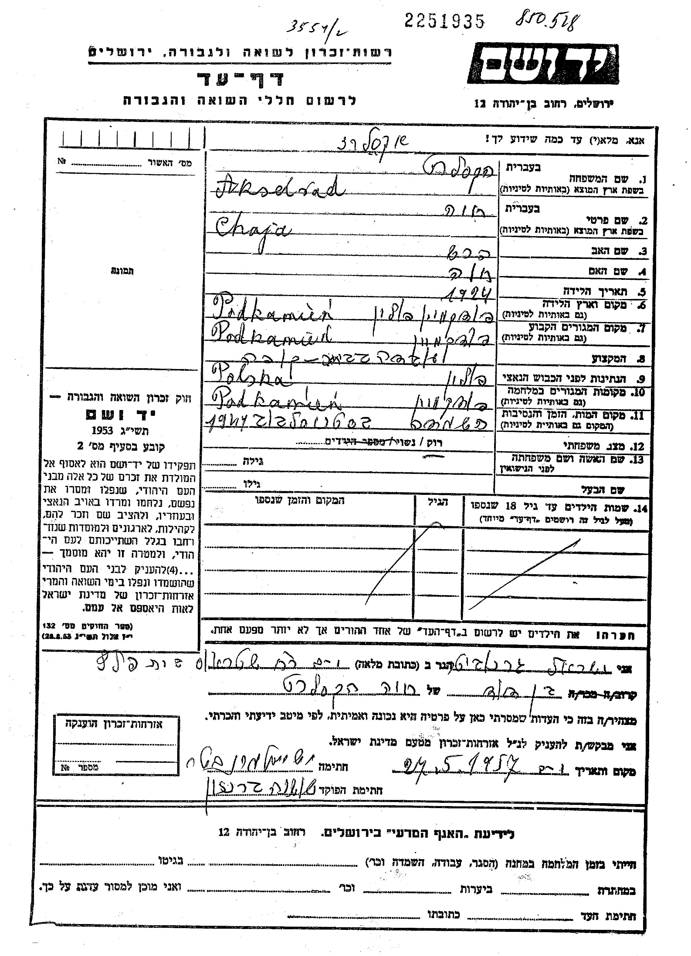 Akselrad Chaja 1924 Podkamien, Pologne Feuille de témoignage