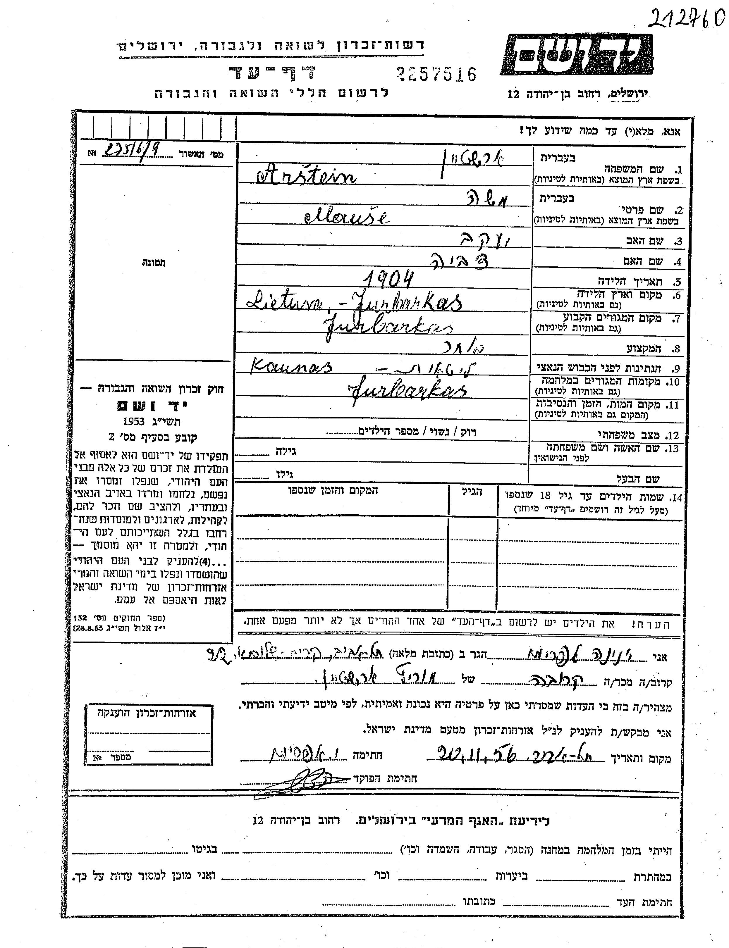 Arshtein Mause 1904 Kaunas, Lituanie Feuille de témoignage