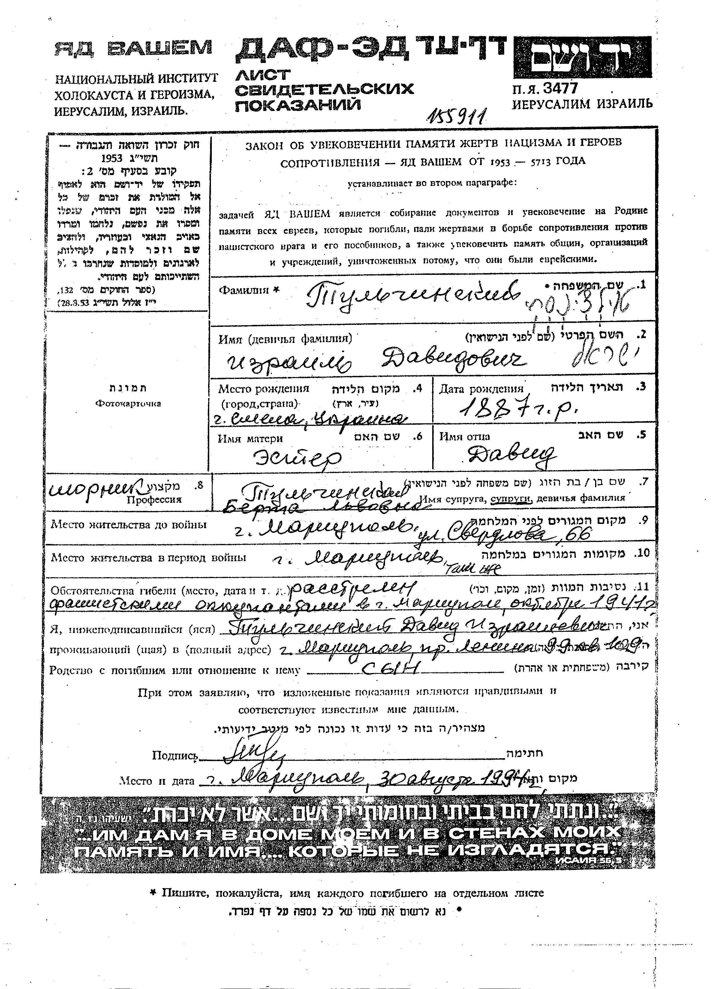 Tulchinski Izrail 1887 Mariupol, Ukraine (URSS) Feuille de témoignage