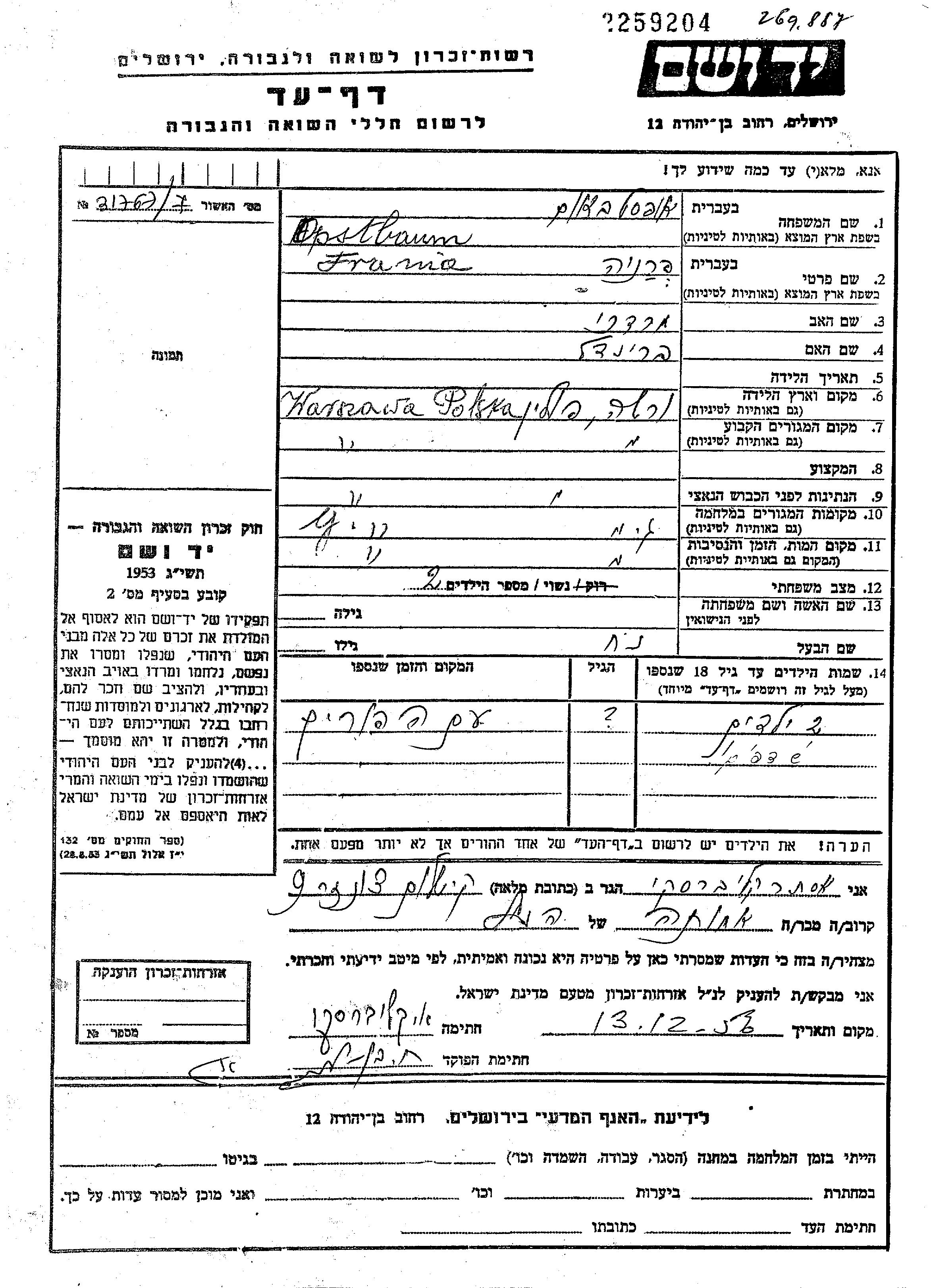 Opstbaum Frania Warszawa, Pologne Feuille de témoignage
