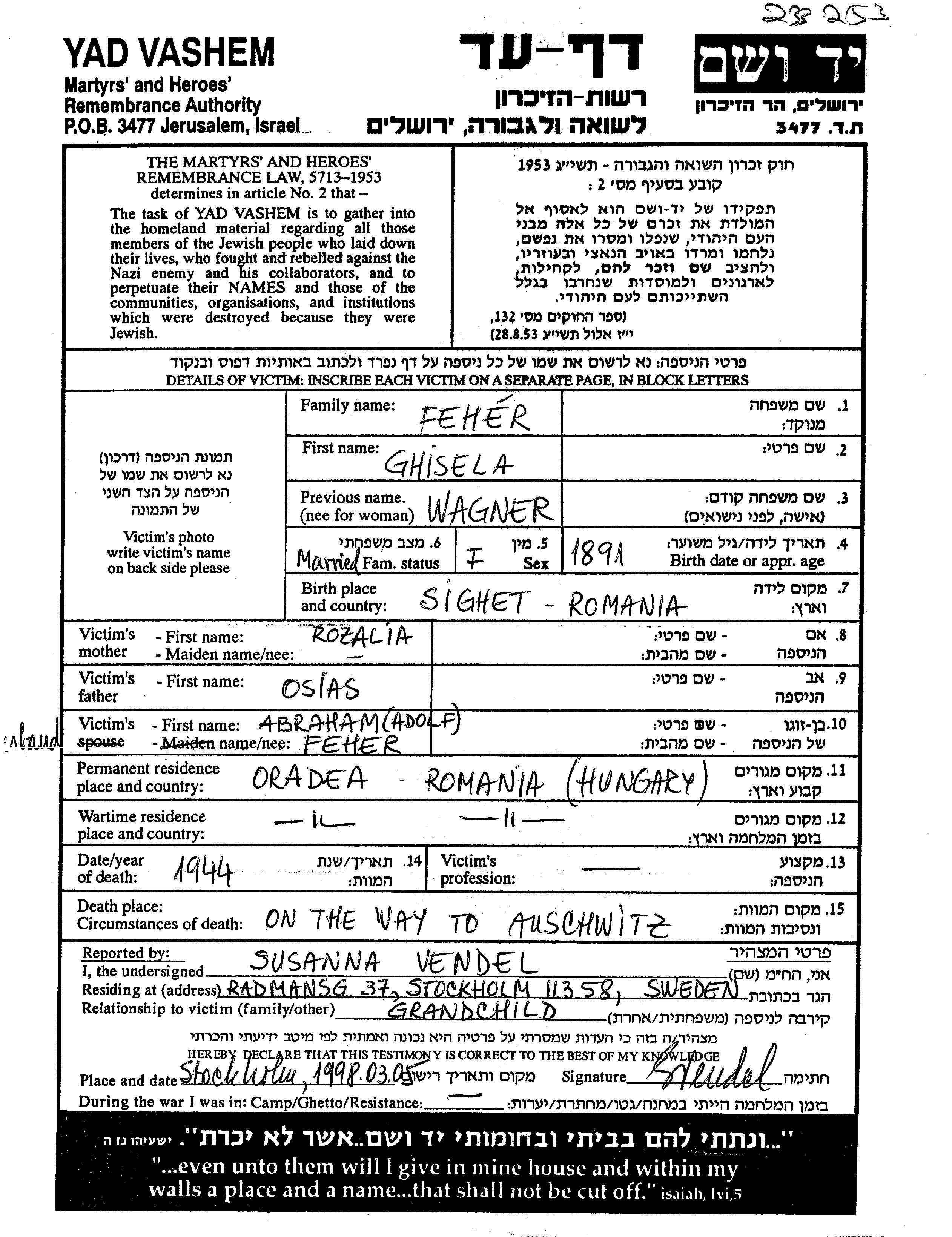 Ghisela Feher Pekher née Wagner est née à Sighet, Roumanie en 1891, fille de Osias et de Rozalia. Elle était Mariée à Abraham Adolf. Avant la seconde guerre mondiale elle vivait à Oradea, Roumanie. Pendant la guerre, elle était à Oradea, Roumanie.