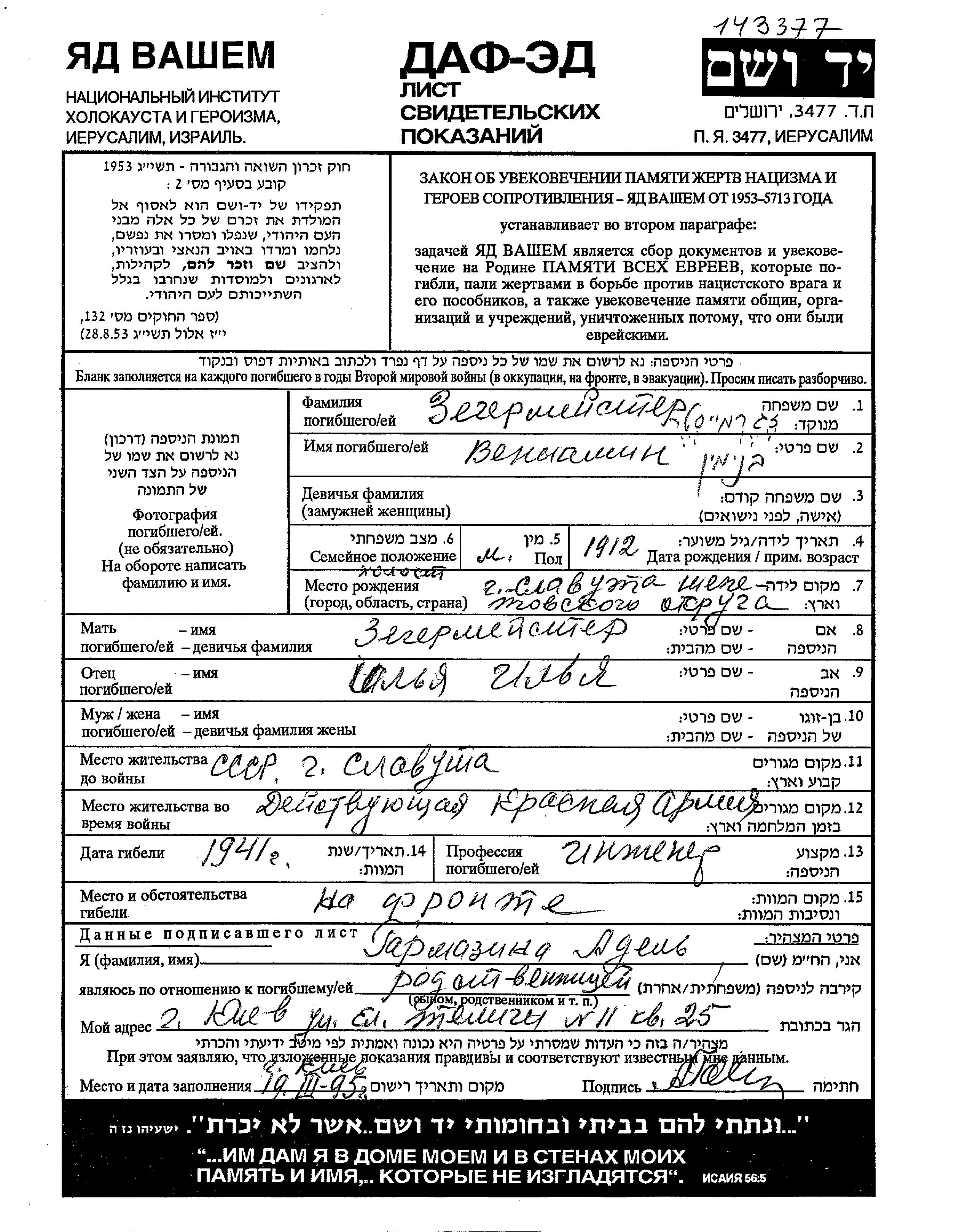 Veniamin Zegermeister est né à Slavuta, Ukraine (URSS) en 1912, fils de Ilia. Il était Ingénieur et Célibataire. Avant la seconde guerre mondiale il vivait à Slavuta, Ukraine (URSS). Au cours de la guerre, il était à the Soviet armed forces.
