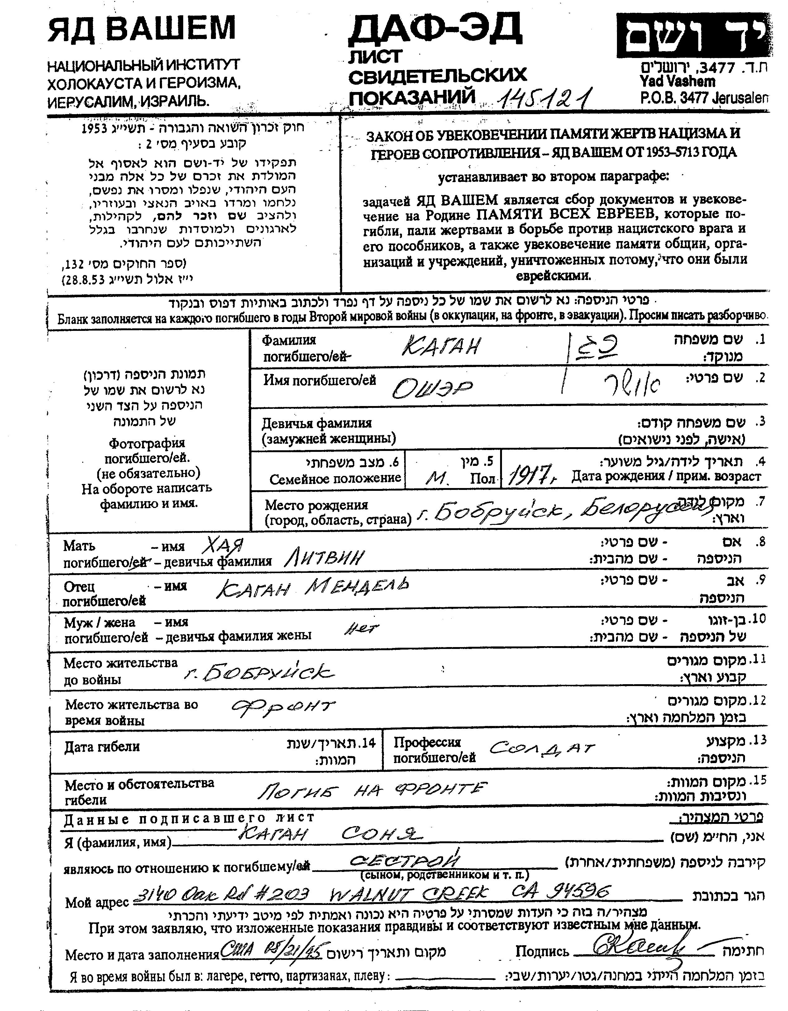Kagan Osher 1917 Bobruysk, Bélorussie (URSS) Feuille de témoignage