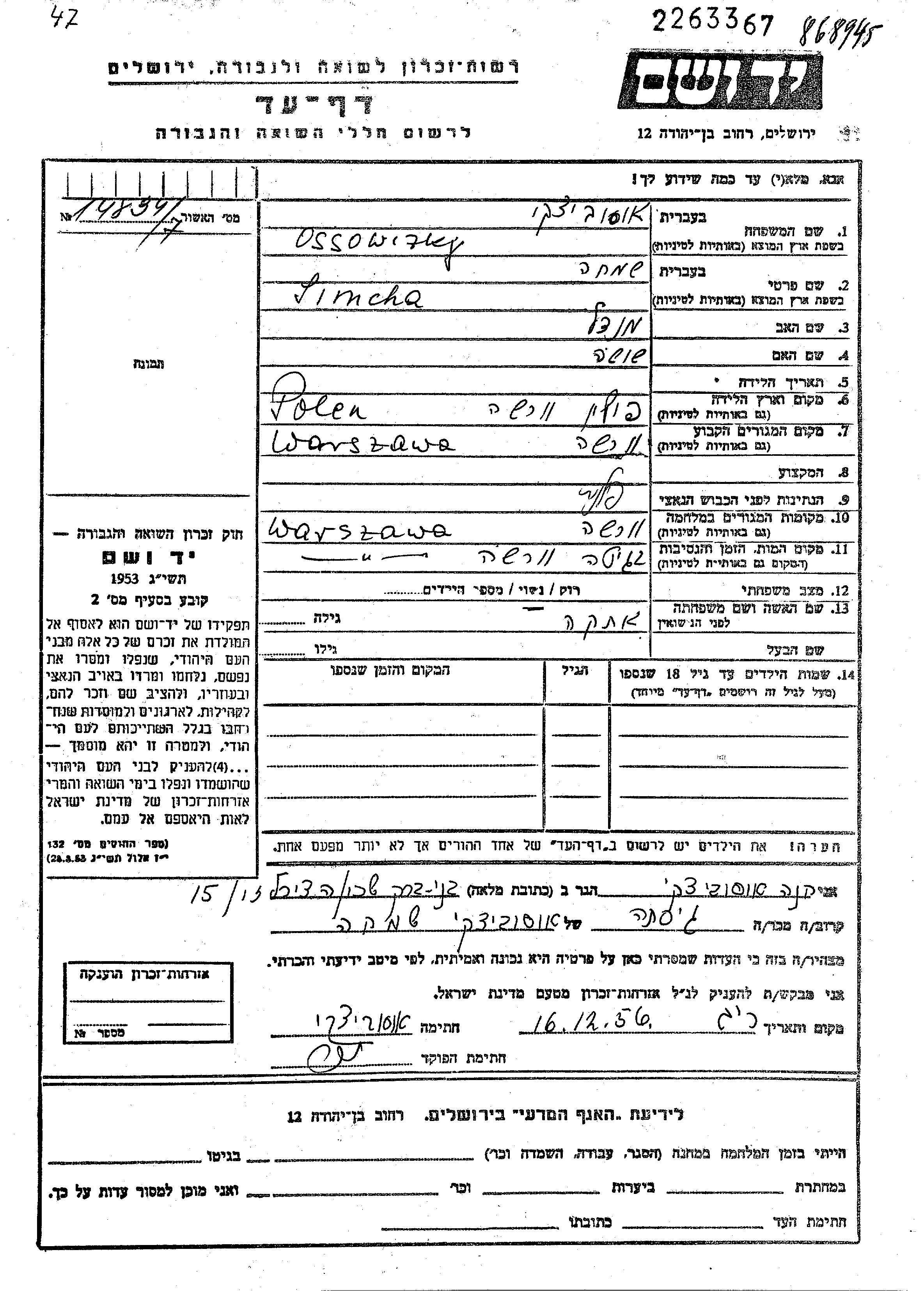 Ossowizky Simcha Warszawa, Pologne Feuille de témoignage